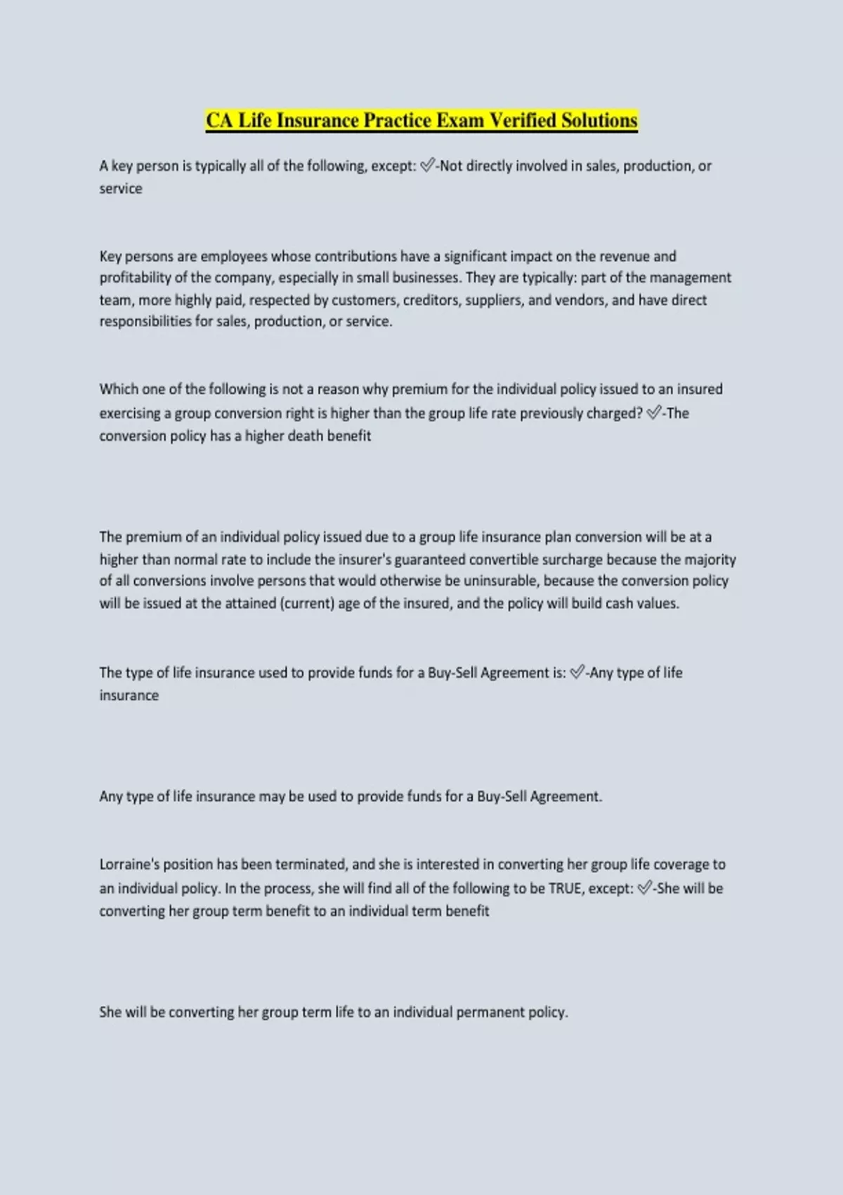 CA Life Insurance Practice Exam Verified Solutions A key person is typically all of the following, except: -Not directly involved in sales, production, or service Key persons are employees whose contributions have a significant impact on the revenue and profitability of the company, especially in small businesses. They are typically: part of the management team, more highly paid, respected by customers, creditors, suppliers, and vendors, and have direct responsibilities for sales, production, or service. Which one of the following is not a reason why premium for the individual policy issued to an insured exercising a group conversion right is higher than the group life rate previously charged? -The conversion policy has a higher death benefit The premium of an individual policy issued due to a group life insurance plan conversion will be at a higher than normal rate to include the insurer's guaranteed convertible surcharge because the majority of all conversions involve persons that would otherwise be uninsurable, because the conversion policy will be issued at the attained (current) age of the insured, and the policy will build cash values. The type of life insurance used to provide funds for a Buy-Sell Agreement is: -Any type of life insurance Any type of life insurance may be used to provide funds for a Buy-Sell Agreement. Lorraine's position has been terminated, and she is interested in converting her group life coverage to an individual policy. In the process, she will find all of the following to be TRUE, except: -She will be converting her group term benefit to an individual term benefit She will be converting her group term life to an individual permanent policy. To help protect against experiencing immediate claims, group plans have a(n) _______ period set up by the group sponsor. -Probationary A probationary period is set up to help reduce the chance of facing immediate claims. How is the funding for Social Security provided? -Through FICA taxes that are paid by both employers and employees Both the employer and employee fund Social Security through paying FICA taxes. Self-employed persons pay the entire amount. The premium for optional dependent group insurance can be payable by: The employer, the employee or both Optional dependent coverage may be paid for by the employer, the employee, or both. When an insurer wishes to implement changes to a group life policy, whom must it notify? The group sponsor Just as in individual contracts, the owner controls the policy. In this case, only the plan sponsor has a policy (i.e. the Master Policy). As such, the insurer must notify the group sponsor of the changes. There is a conversion period of how many days in which the employee may, upon termination of eligibility and without evidence of insurability, convert his/her group life insurance benefit to an individual permanent policy? 31 There is a conversion period of 31 days in which the employee may, upon termination of eligibility and without evidence of insurability, convert his/her group life insurance benefit to an individual permanent policy. The proceeds from a _________ plan provide the necessary funds to recruit, hire, and train a replacement employee. Key employee Key employee life insurance plans provide the funds to recruit, hire, and train a replacement employee. Which of the following is a disadvantage of being covered under a group insurance plan? The group sponsor can elect to discontinue the plan, and the insurance company can increase the rates it charges The advantage of an insurance funded buy-sell agreement is: It is a legally enforceable agreement, which pre-establishes the value of the business, and provides the funds for an efficient method of transferring the deceased's business interest Some of the advantages of having such an agreement: it is legally enforceable, the value of the business is previously agreed upon, it is an immediate and automatic method of transferring the deceased's interest due to readily available funds. An agreement by an employer to continue a key employee's salary upon retirement, death or disability as long as the employee continues employment during the term of the agreement is called a: Salary continuation plan An agreement by an employer to continue a key employee's salary upon retirement, death or disability as long as the employee continues employment during the term of the agreement is called a salary continuation plan. Which of the following is not one of the most common methods of determining group insurance benefits? Tax bracket The most common methods of determining group insurance benefits are flat benefit (all employees receive the same insurance amounts), percentage of income (employees receive 100%, 150%, or 200% of their annual base wage, subject to imputed income), and position in the company (the employer may establish different benefits for specific classes of employees, but may not discriminate between employees in the same class). To be fully insured for Social Security, generally a person must have worked and paid into the Social