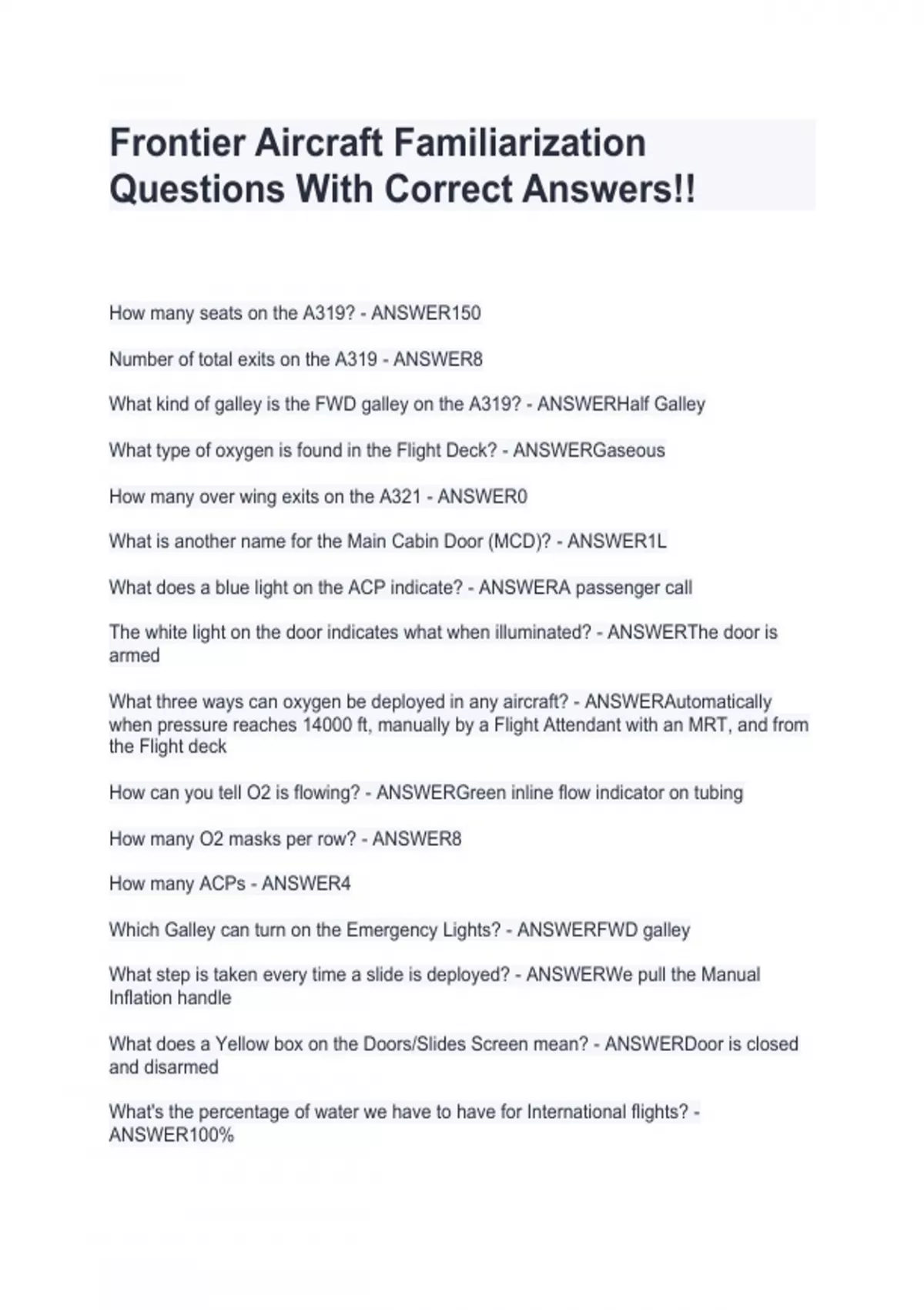 Frontier Aircraft Familiarization Questions With Correct Answers!!