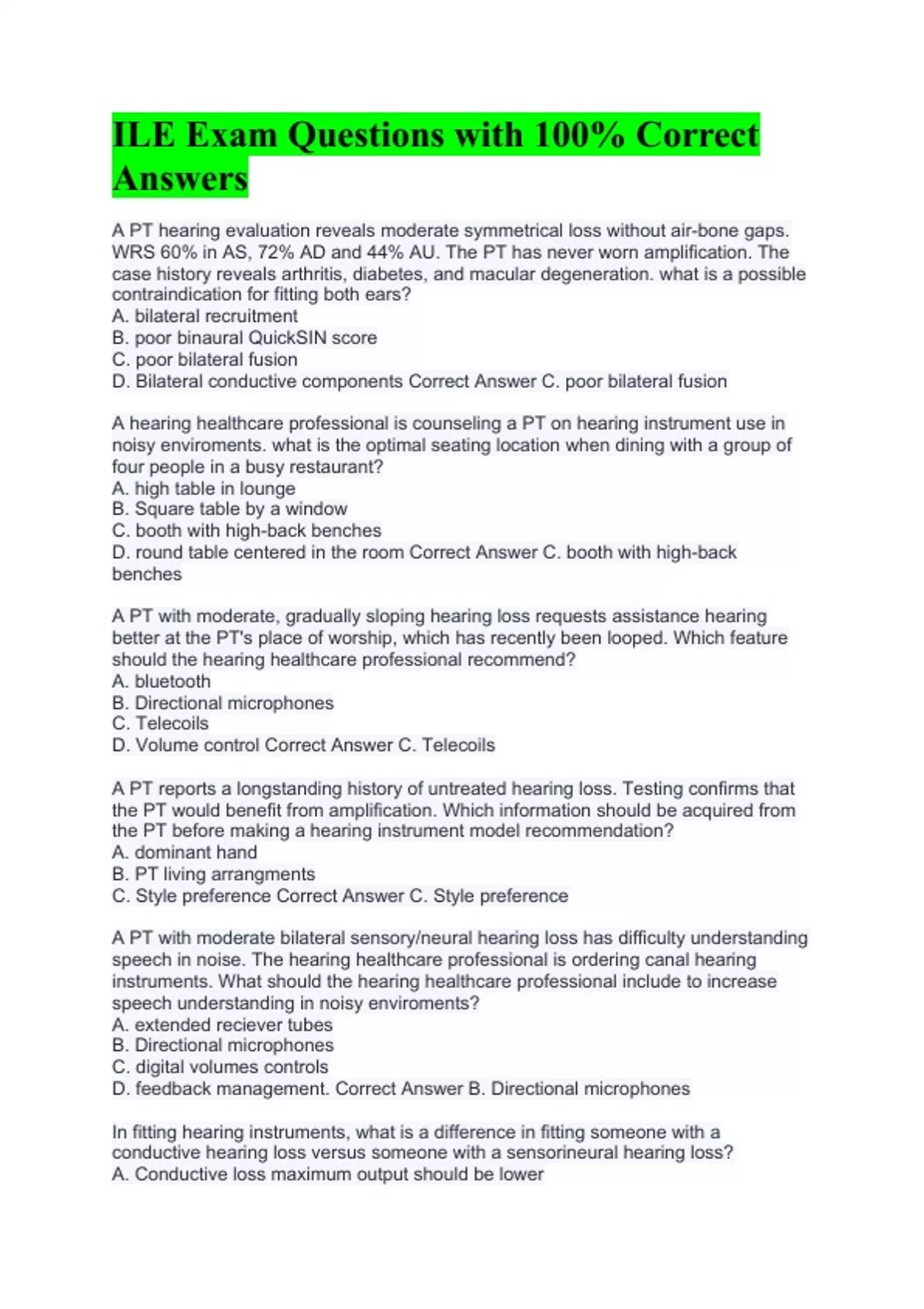 A PT hearing evaluation reveals moderate symmetrical loss without air-bone gaps. WRS 60% in AS, 72% AD and 44% AU. The PT has never worn amplification. The case history reveals arthritis, diabetes, and macular degeneration. what is a possible contraindication for fitting both ears? A. bilateral recruitment B. poor binaural QuickSIN score C. poor bilateral fusion D. Bilateral conductive components Correct Answer C. poor bilateral fusion A hearing healthcare professional is counseling a PT on hearing instrument use in noisy enviroments. what is the optimal seating location when dining with a group of four people in a busy restaurant? A. high table in lounge B. Square table by a window C. booth with high-back benches D. round table centered in the room Correct Answer C. booth with high-back benches A PT with moderate, gradually sloping hearing loss requests assistance hearing better at the PT's place of worship, which has recently been looped. Which feature should the hearing healthcare professional recommend? A. bluetooth B. Directional microphones C. Telecoils D. Volume control Correct Answer C. Telecoils A PT reports a longstanding history of untreated hearing loss. Testing confirms that the PT would benefit from amplification. Which information should be acquired from the PT before making a hearing instrument model recommendation? A. dominant hand B. PT living arrangments C. Style preference Correct Answer C. Style preference A PT with moderate bilateral sensory/neural hearing loss has difficulty understanding speech in noise. The hearing healthcare professional is ordering canal hearing instruments. What should the hearing healthcare professional include to increase speech understanding in noisy enviroments? A. extended reciever tubes B. Directional microphones C. digital volumes controls D. feedback management. Correct Answer B. Directional microphones In fitting hearing instruments, what is a difference in fitting someone with a conductive hearing loss versus someone with a sensorineural hearing loss? A. Conductive loss maximum output should be lower
