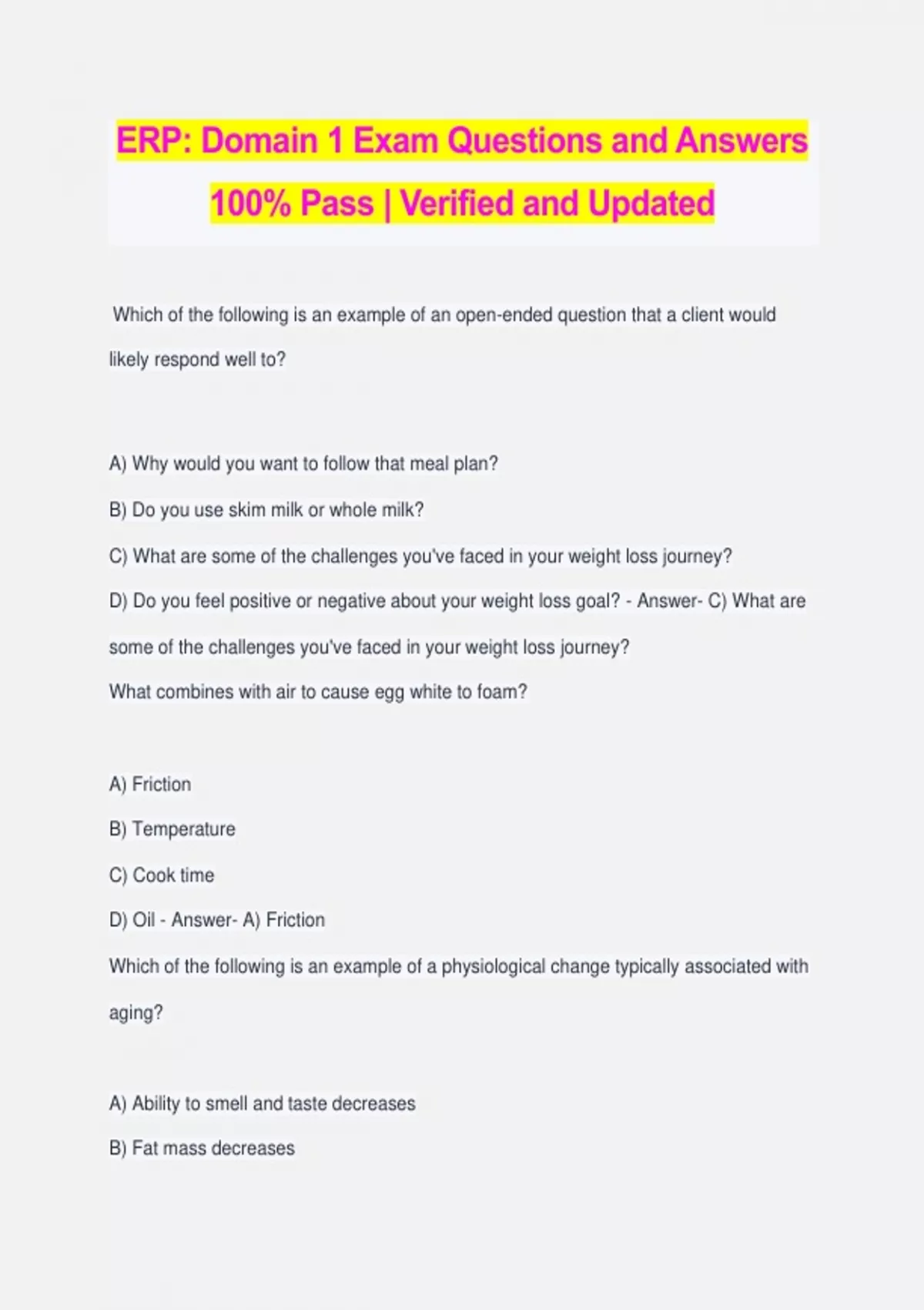 ERP: Domain 1 Exam Questions and Answers 100% Pass | Verified and Updated Which of the following is an example of an open-ended question that a client would likely respond well to? A) Why would you want to follow that meal plan? B) Do you use skim milk or whole milk? C) What are some of the challenges you've faced in your weight loss journey? D) Do you feel positive or negative about your weight loss goal? - Answer- C) What are some of the challenges you've faced in your weight loss journey? What combines with air to cause egg white to foam? A) Friction B) Temperature C) Cook time D) Oil - Answer- A) Friction Which of the following is an example of a physiological change typically associated with aging? A) Ability to smell and taste decreases B) Fat mass decreases C) Secretion of gastric juice increases D) Blood pressure decreases - Answer- A) Ability to smell and taste decreases Baking soda is typically used when a batter contains which type of ingredient? A) Acidic B) Sweet C) Sour D) Fruit based - Answer- A) Acidic Excessive intake of phytates and oxalates can interfere with the absorption of A) cholesterol. B) minerals. C) vitamins. D) fiber. - Answer- B) minerals Canned corn has more sodium and less potassium than fresh corn. This is the result of A) processing. B) enrichment. C) fortification. D) additives. - Answer- A) processing The part of the brain that is critical to regulating hunger and satiety is the A) cerebral cortex. B) cerebellum. C) hypothalamus. D) medulla. - Answer- C) hypothalamus Which of the following is necessary in order to absorb folate consumed from green, leafy vegetables? A) Phosphate groups must be removed by the action of alkaline phosphatase B) Glutamate must be transaminated to form alpha-ketoglutarate C) Glutamic acid molecules must be removed D) Glutamic acid molecules must be added - Answer- C) Glutamic acid molecules must be removed The separation of a liquid from a gel—for example, when whey collects on the surface of yogurt—is known as A) condensation. B) syneresis. C) retrogradation. D) gelatinization. - Answer- B) syneresis One disadvantage to adding baking soda to green beans or broccoli is that A) the vegetables' texture becomes mushy and soft. B) the vegetables lose fat-soluble vitamins. C) the vegetables will dull in or lose color. D) the vegetables will taste extremely salty. - Answer- A) the vegetables' texture becomes mushy and soft. Which of the following is an example of a positive correlation? A) "The amount of weight gained by pregnant people during the first trimester has been found to decrease as the number of episodes of nausea and vomiting increase." B) "The incidence of type 2 diabetes mellitus increases as central adiposity increases." C) "Consuming calories in excess of those needed results in generalized adiposity." D) "Blood pressure readings in certain populations decrease as messaging about impact of dietary sodium increases." - Answer- B) "The incidence of type 2 diabetes mellitus increases as central adiposity increases." What is pyridoxine another name for? A) Vitamin C B) Vitamin B1 C) Vitamin B12 D) Vitamin B6 - Answer- D) Vitamin B6 The astringent taste of fruits and vegetables is the result of the following component: A) Anthocyanin B) Tannin C) Carotene D) Monosodium glutamate - Answer- B) Tannin