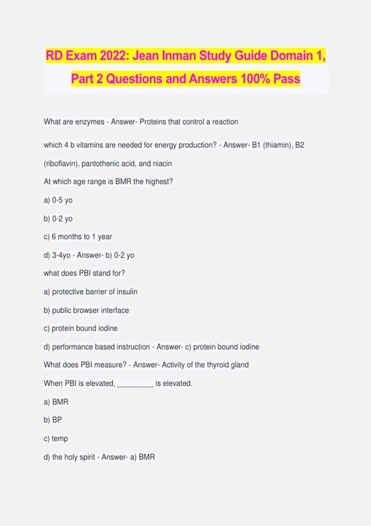 RD Exam 2022: Jean Inman Study Guide Domain 1, Part 2 Questions and Answers 100% Pass What are enzymes - Answer- Proteins that control a reaction which 4 b vitamins are needed for energy production? - Answer- B1 (thiamin), B2 (riboflavin), pantothenic acid, and niacin At which age range is BMR the highest? a) 0-5 yo b) 0-2 yo c) 6 months to 1 year d) 3-4yo - Answer- b) 0-2 yo what does PBI stand for? a) protective barrier of insulin b) public browser interface c) protein bound iodine d) performance based instruction - Answer- c) protein bound iodine What does PBI measure? - Answer- Activity of the thyroid gland When PBI is elevated, _________ is elevated. a) BMR b) BP c) temp d) the holy spirit - Answer- a) BMR What are the 9 amino acids? (*Hint: TV TILL PMH*) - Answer- histidine, isoleucine, leucine, lysine, methionine, phenylalanine, threonine, tryptophan, valine Which oil is the most POLYUNSATURATED? a) canola b) motor c) olive d) safflower - Answer- d) safflower Which oil is the most UNSATURATED a) canola b) motor c) olive d) safflower - Answer- a) canola when there is a lack of linoleic acid, which option is the BEST outcome: a) poor growth rate b) overactive growth rate - Answer- a) poor growth rate The location of the first double bond, counted from the ____________ end of the fatty acid, is designated by the omega sign