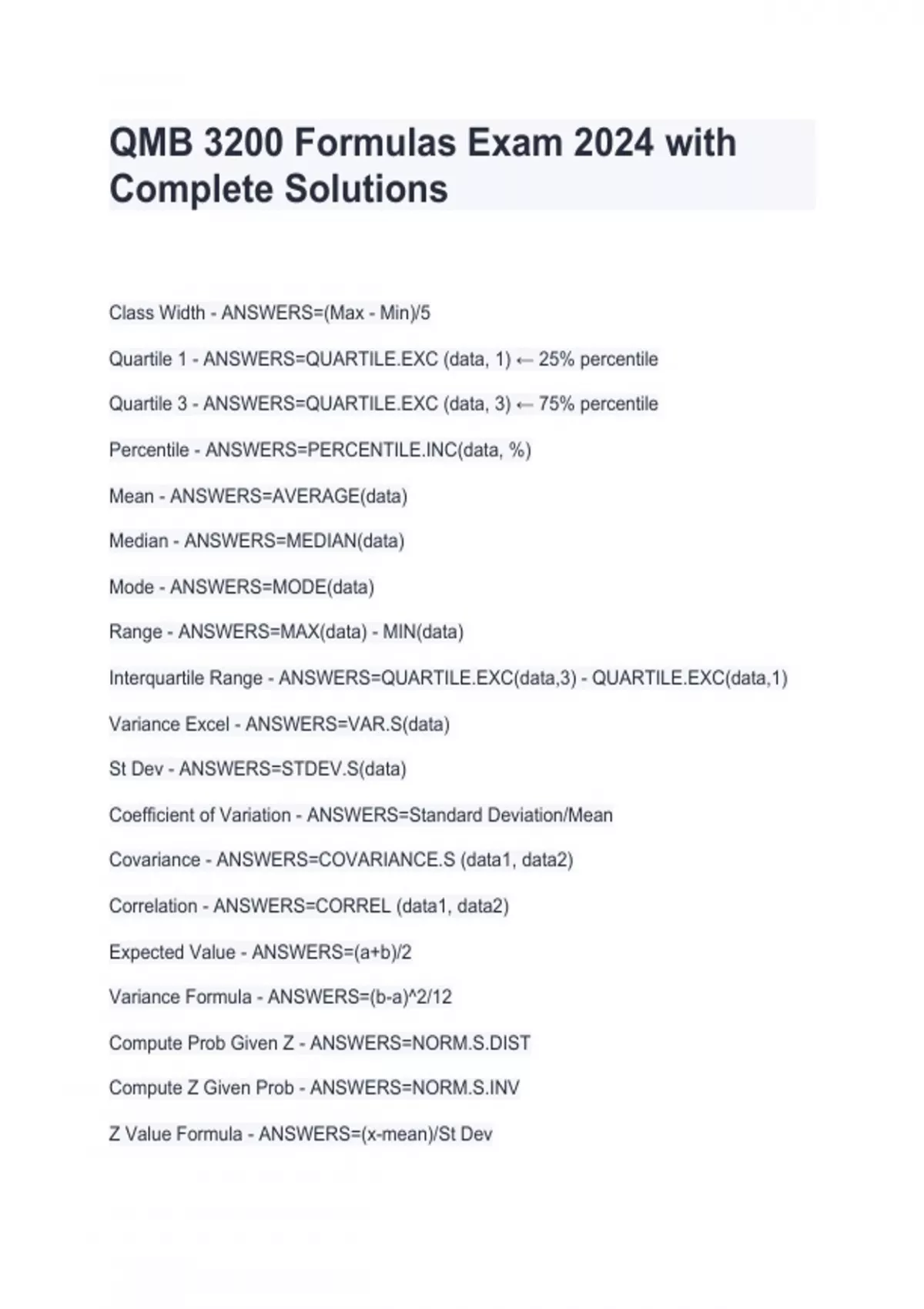 QMB 3200 Formulas Exam 2024 with Complete Solutions QMB 3200 Formulas Exam 2024 with Complete Solutions QMB 3200 Formulas Exam 2024 with Complete Solutions QMB 3200 Formulas Exam 2024 with Complete Solutions Class Width - ANSWERS=(Max - Min)/5 Quartile 1 - ANSWERS=QUARTILE.EXC (data, 1) ← 25% percentile