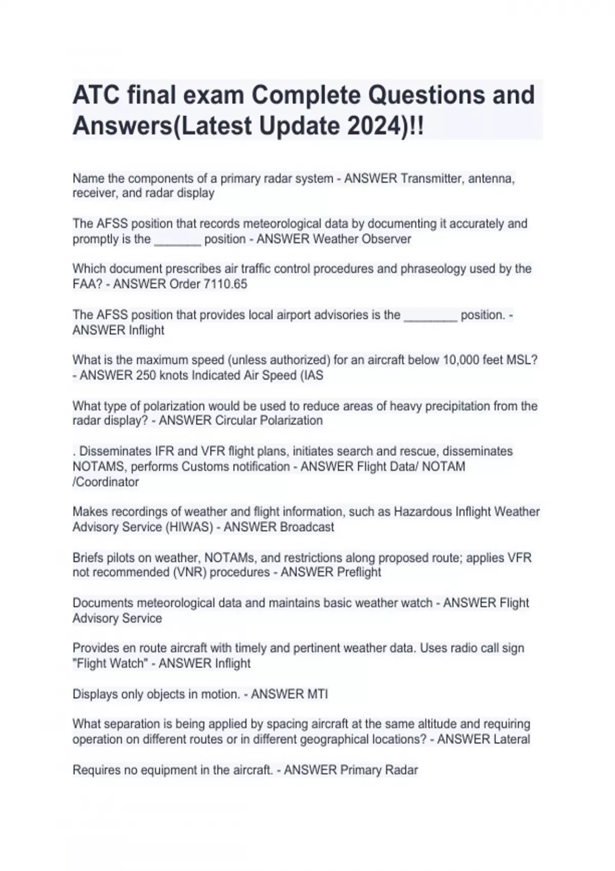 ATC final exam Complete Questions a Name the components of a primary radar system - ANSWER Transmitter, antenna, receiver, and radar display The AFSS position that records meteorological data by documenting it accurately and promptly is the _______ position - ANSWER Weather Observer Which document prescribes air traffic control procedures and phraseology used by the FAA? - ANSWER Order 7110.65 The AFSS position that provides local airport advisories is the ________ position. - ANSWER Inflight What is the maximum speed (unless authorized) for an aircraft below 10,000 feet MSL? - ANSWER 250 knots Indicated Air Speed (IAS What type of polarization would be used to reduce areas of heavy precipitation from the radar display? - ANSWER Circular Polarization . Disseminates IFR and VFR flight plans, initiates search and rescue, disseminates NOTAMS, performs Customs notification - ANSWER Flight Data/ NOTAM /Coordinator Makes recordings of weather and flight information, such as Hazardous Inflight Weather Advisory Service (HIWAS) - ANSWER Broadcast Briefs pilots on weather, NOTAMs, and restrictions along proposed route; applies VFR not recommended (VNR) procedures - ANSWER Preflight Documents meteorological data and maintains basic weather watch - ANSWER Flight Advisory Service Provides en route aircraft with timely and pertinent weather data. Uses radio call sign "Flight Watch" - ANSWER Inflight Displays only objects in motion. - ANSWER MTI What separation is being applied by spacing aircraft at the same altitude and requiring operation on different routes or in different geographical locations? - ANSWER Lateral Requires no equipment in the aircraft. - ANSWER Primary Radar From what facility would you receive landing clearance? - ANSWER ATCT Focuses, broadcasts, and collects reflected radio energy. - ANSWER Antenna Depicts the position and movement of objects which have reflected radio energy. - ANSWER Radar Display What separation is achieved by the assignment of different altitudes or flight levels? - ANSWER Vertical Reduces or eliminates echoes from precipitation. - ANSWER Circular Polarization For fixed-wing aircraft, vortices begin at what stage of flight? - ANSWER At rotation or when lift begins To apply the departure divergence rule you must assign headings which diverge by at least ____ degrees. - ANSWER 45 Radar transmission that will cause an echo from anything that has mass. - ANSWER Linear Polarization Radar indications of aircraft or objects that do not exist. - ANSWER False Targets Wake turbulence has the greatest impact on ATC in the areas of - ANSWER increased separation and traffic management delays. Appearance of clutter on scope caused by moisture in the air bending the radar signal. - ANSWER Anomalous Propagation Desind Answers(Latest Update 2024)!!