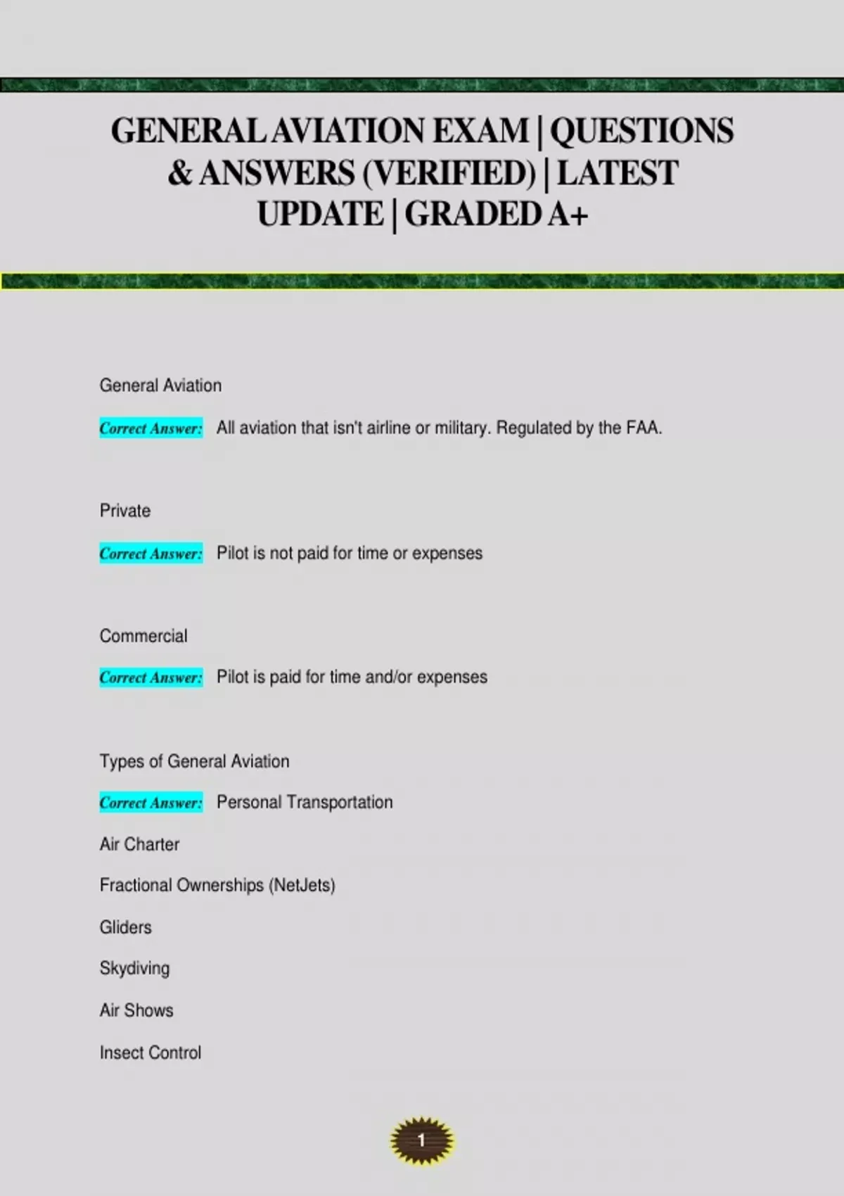 GENERAL AVIATION EXAM | QUESTIONS & ANSWERS (VERIFIED) | LATEST UPDATE | GRADED A+ General Aviation Correct Answer: All aviation that isn't airline or military. Regulated by the FAA. Private Correct Answer: Pilot is not paid for time or expenses Commercial Correct Answer: Pilot is paid for time and/or expenses Types of General Aviation Correct Answer: Personal Transportation Air Charter Fractional Ownerships (NetJets) Gliders Skydiving Air Shows Insect Control 2 Law Enforcement Air Ambulances Firefighting Emergency Management Flight Training Correct Answer: FAR Part 61 FAR Part 141 Where is General Aviation Correct Answer: 5,200 Public Use airports in the United States. 14,000 total airports in 2010 (FAA). Heliports, Seaplane bases, and more. General Aviation In Columbus Correct Answer: The Ohio State University Airport Bolton Field Port Columbus General Aviation Organizations Correct Answer: Aircraft Owners and Pilots Association Experimental Aircraft Associatio