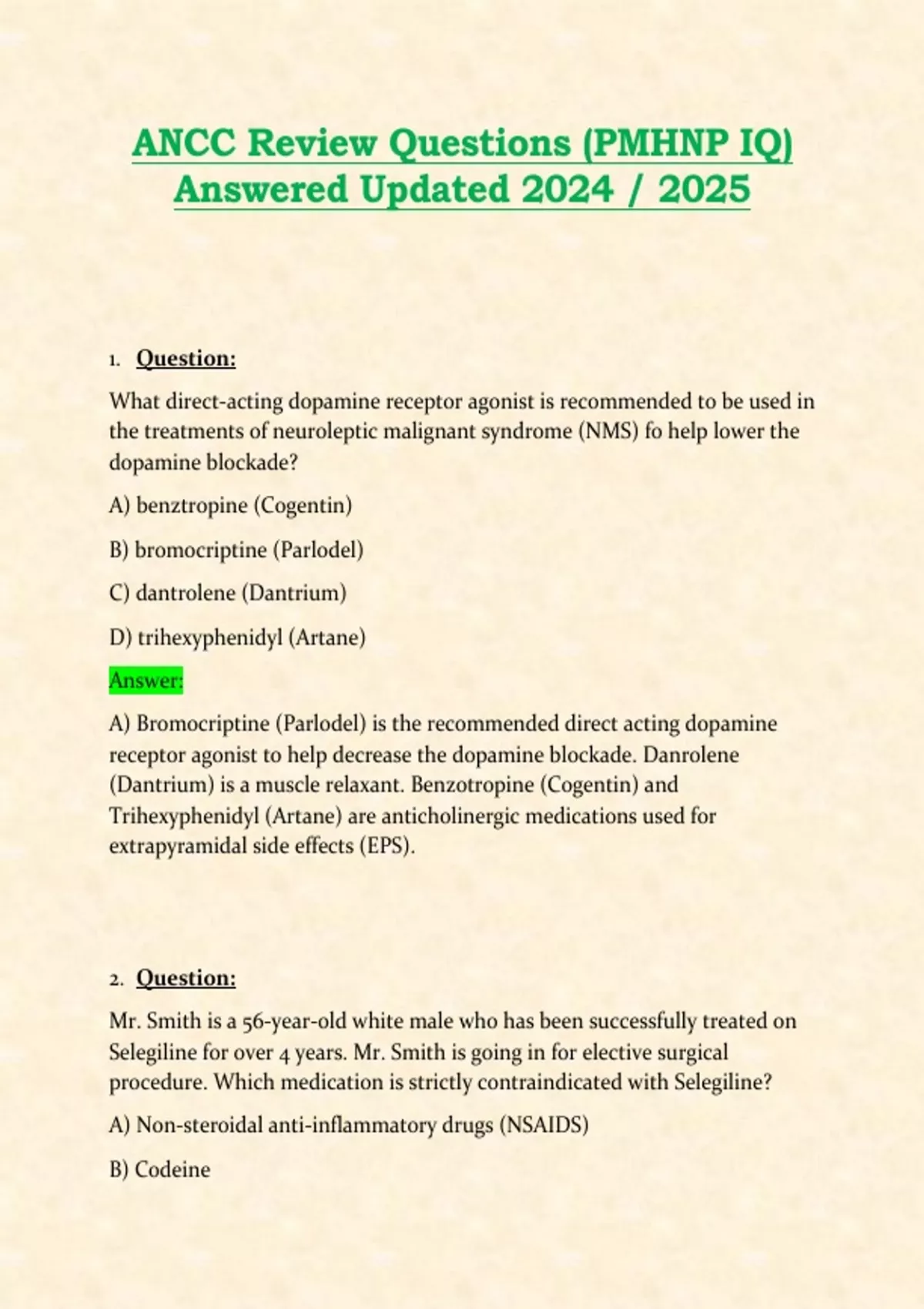 ANCC Review Questions (PMHNP IQ) Answered Updated 2024 / 2025 1. Question: What direct-acting dopamine receptor agonist is recommended to be used in the treatments of neuroleptic malignant syndrome (NMS) fo help lower the dopamine blockade? A) benztropine (Cogentin) B) bromocriptine (Parlodel) C) dantrolene (Dantrium) D) trihexyphenidyl (Artane) Answer: A) Bromocriptine (Parlodel) is the recommended direct acting dopamine receptor agonist to help decrease the dopamine blockade. Danrolene (Dantrium) is a muscle relaxant. Benzotropine (Cogentin) and Trihexyphenidyl (Artane) are anticholinergic medications used for extrapyramidal side effects (EPS). 2. Question: Mr. Smith is a 56-year-old white male who has been successfully treated on Selegiline for over 4 years. Mr. Smith is going in for elective surgical procedure. Which medication is strictly contraindicated with Selegiline? A) Non-steroidal anti-inflammatory drugs (NSAIDS) B) Codeine C) Morphine D) Meperidine Answer: D) Meperidine is strictly prohibited when a patient is treated on a monoamine oxidase inhibitor (MAOI) due to the risk of hypertensive crisis and death. 3. Question: A WBC of 4,000 in a patient taking Clozapine would prompt the PMHNP to take which of the following actions? A) Consult with hematologist to determine appropriate antibiotic regimen and monitor closely. B) Institute twice-weekly complete blood count with differentials and monitor closely. C) Discontinue clozapine, initiate alternative antipsychotic medication and monitor closely. D) Institute daily complete blood count with differentials and monitor closely. Answer: B) Institute twice-weekly complete blood count with differentials and monitor closely. The recommended cut-points for discontinuation of clozapine are WBC of 2,000 to 3,000 or granulocytes of 1,000 to 1,500 for agranulocytosis and severely compromised immune system. At a WBC of 4,000, the recommendation is to closely monitor CBC with differential twice a week