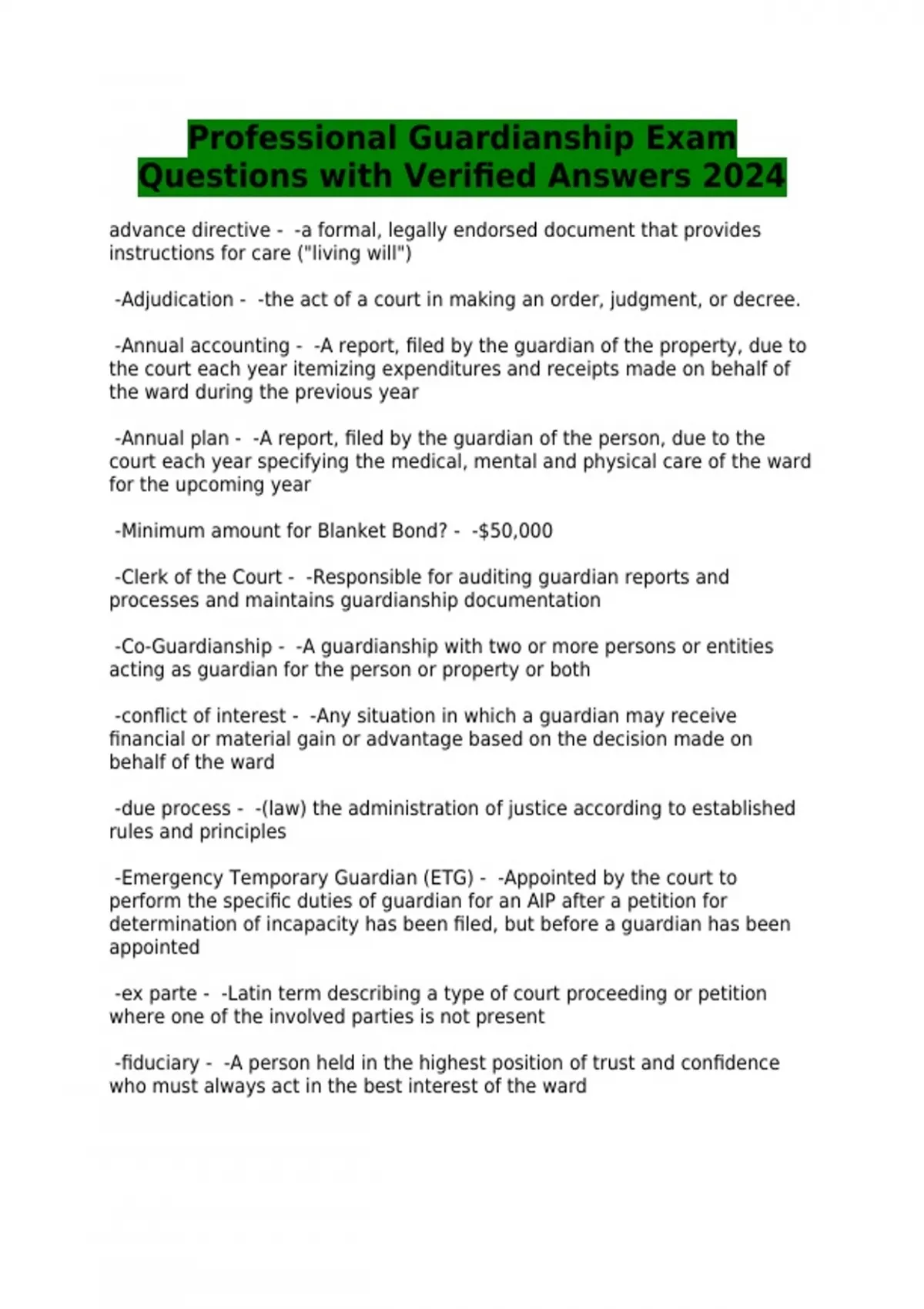 Professional Guardianship Exam Questions with Verified Answers 2024