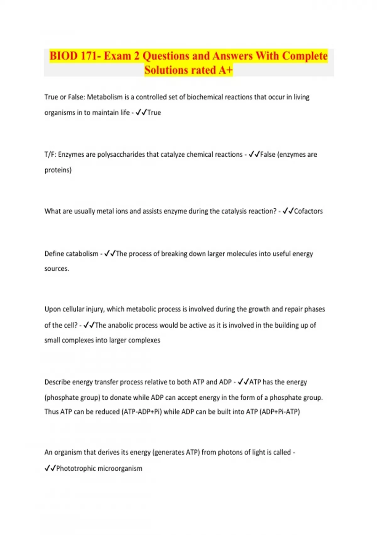 BIOD 171- Exam 2 Questions and Answers With Complete Solutions rated A+ True or False: Metabolism is a controlled set of biochemical reactions that occur in living organisms in to maintain life - True T/F: Enzymes are polysaccharides that catalyze chemical reactions - False (enzymes are proteins) What are usually metal ions and assists enzyme during the catalysis reaction? - Cofactors Define catabolism - The process of breaking down larger molecules into useful energy sources. Upon cellular injury, which metabolic process is involved during the growth and repair phases of the cell? - The anabolic process would be active as it is involved in the building up of small complexes into larger complexes Describe energy transfer process relative to both ATP and ADP - ATP has the energy (phosphate group) to donate while ADP can accept energy in the form of a phosphate group. Thus ATP can be reduced (ATP-ADP+Pi) while ADP can be built into ATP (ADP+Pi-ATP)