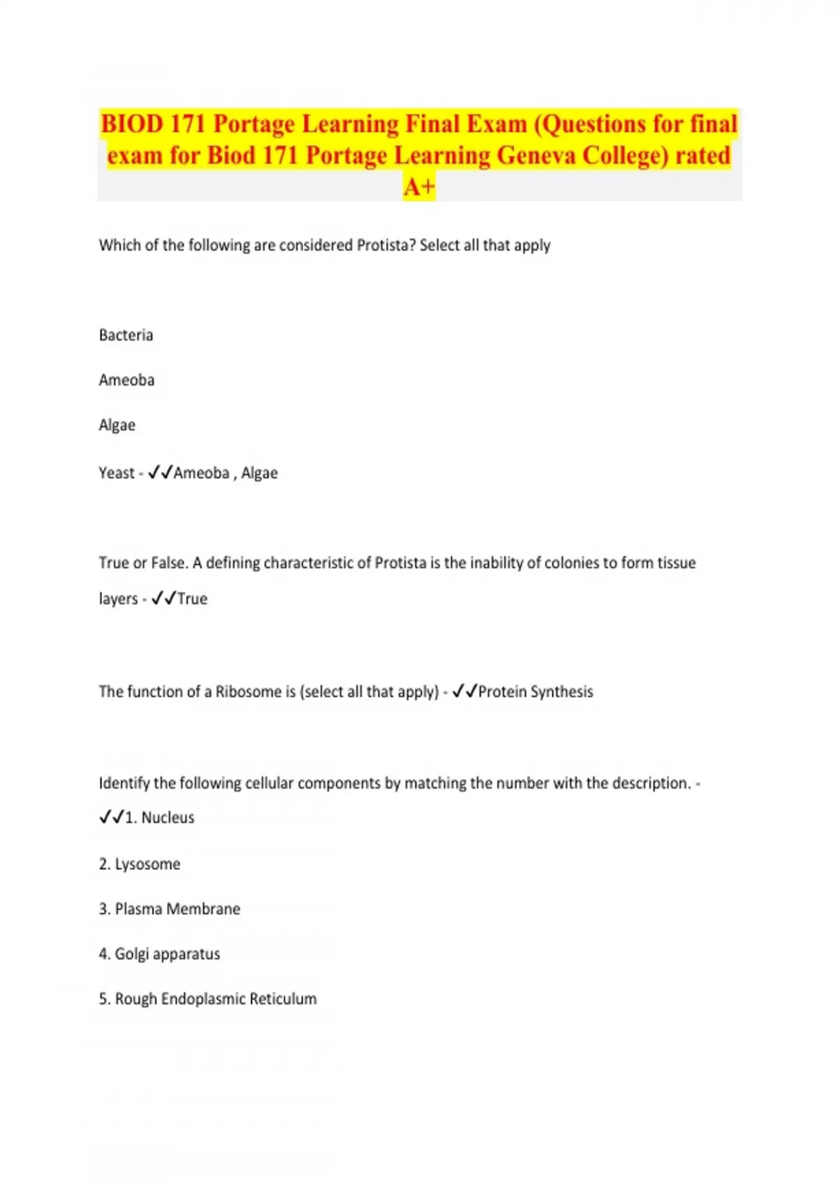 BIOD 171 Portage Learning Final Exam (Questions for final exam for Biod 171 Portage Learning Geneva College) rated A+ Which of the following are considered Protista? Select all that apply Bacteria Ameoba Algae Yeast - Ameoba , Algae True or False. A defining characteristic of Protista is the inability of colonies to form tissue layers - True The function of a Ribosome is (select all that apply) - Protein Synthesis Identify the following cellular components by matching the number with the description. - 1. Nucleus 2. Lysosome 3. Plasma Membrane 4. Golgi apparatus 5. Rough Endoplasmic Reticulum
