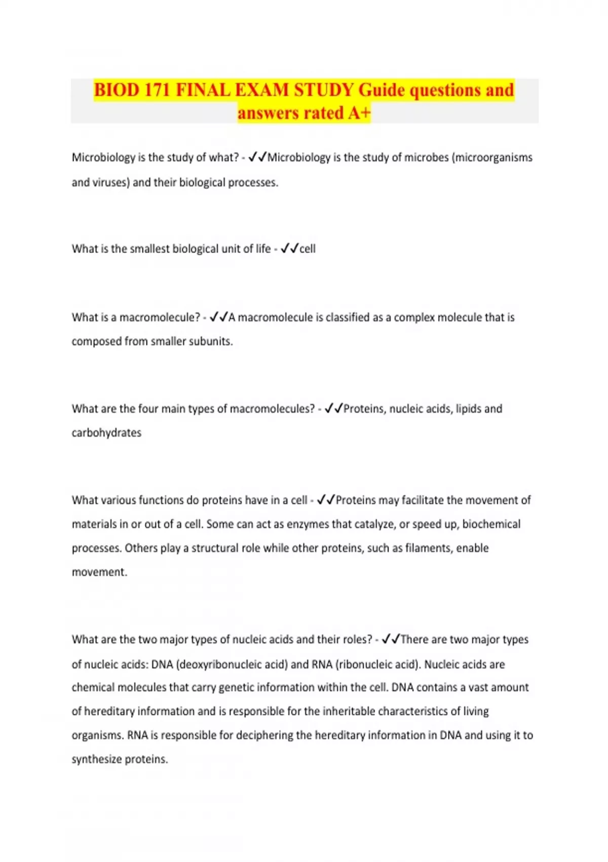BIOD 171 FINAL EXAM STUDY Guide questions and answers rated A+ Microbiology is the study of what? - Microbiology is the study of microbes (microorganisms and viruses) and their biological processes. What is the smallest biological unit of life - cell What is a macromolecule? - A macromolecule is classified as a complex molecule that is composed from smaller subunits. What are the four main types of macromolecules? - Proteins, nucleic acids, lipids and carbohydrates What various functions do proteins have in a cell - Proteins may facilitate the movement of materials in or out of a cell. Some can act as enzymes that catalyze, or speed up, biochemical processes. Others play a structural role while other proteins, such as filaments, enable movement. What are the two major types of nucleic acids and their roles? - There are two major types of nucleic acids: DNA (deoxyribonucleic acid) and RNA (ribonucleic acid). Nucleic acids are chemical molecules that carry genetic information within the cell. DNA contains a vast amount of hereditary information and is responsible for the inheritable characteristics of living organisms. RNA is responsible for deciphering the hereditary information in DNA and using it to synthesize proteins