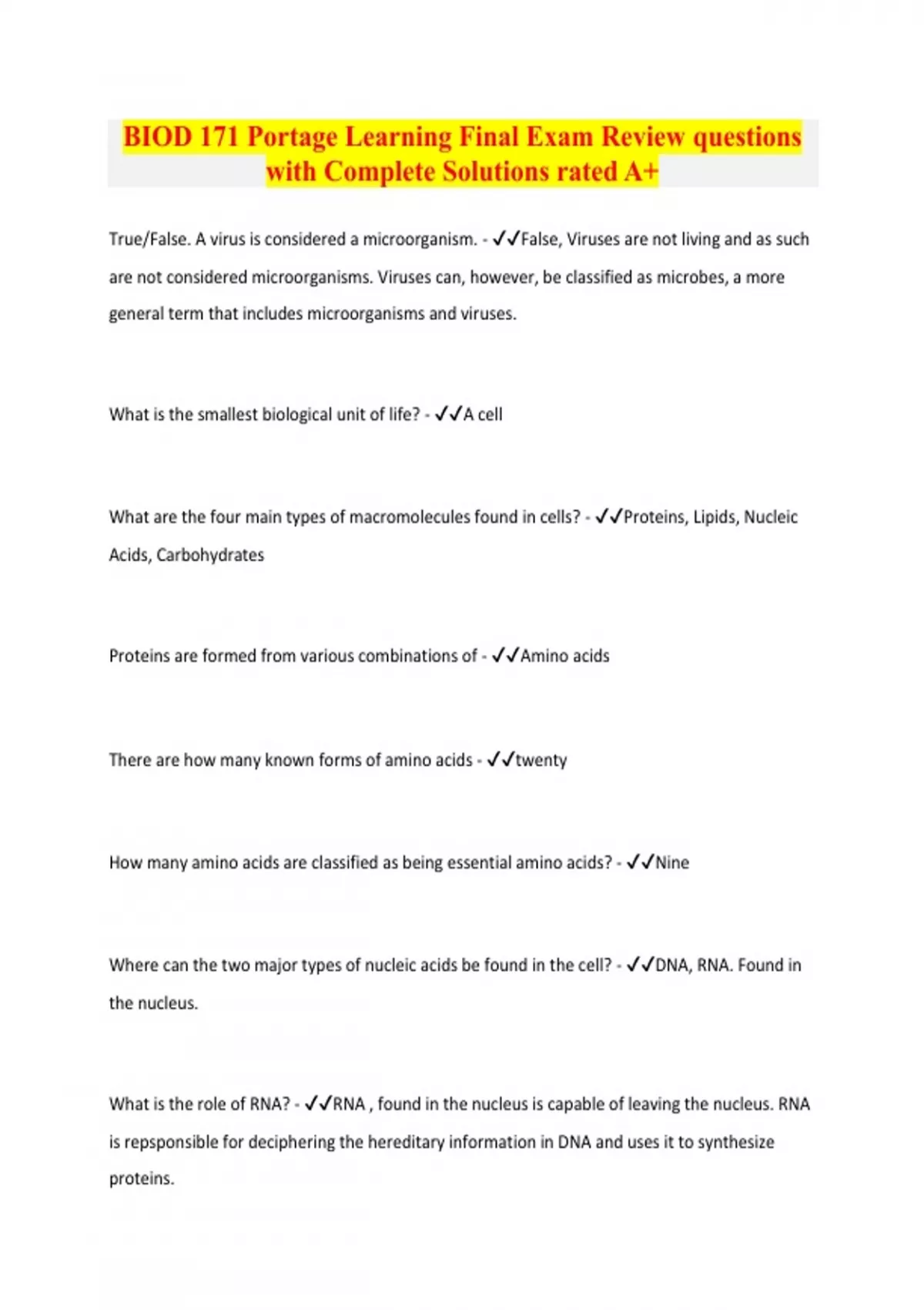 BIOD 171 Portage Learning Final Exam Review questions with Complete Solutions rated A+ True/False. A virus is considered a microorganism. - False, Viruses are not living and as such are not considered microorganisms. Viruses can, however, be classified as microbes, a more general term that includes microorganisms and viruses. What is the smallest biological unit of life? - A cell What are the four main types of macromolecules found in cells? - Proteins, Lipids, Nucleic Acids, Carbohydrates Proteins are formed from various combinations of - Amino acids There are how many known forms of amino acids - twenty How many amino acids are classified as being essential amino acids? - Nine Where can the two major types of nucleic acids be found in the cell? - DNA, RNA. Found in the nucleus. What is the role of RNA? - RNA , found in the nucleus is capable of leaving the nucleus. RNA is repsponsible for deciphering the hereditary information in DNA and uses it to synthesize proteins.