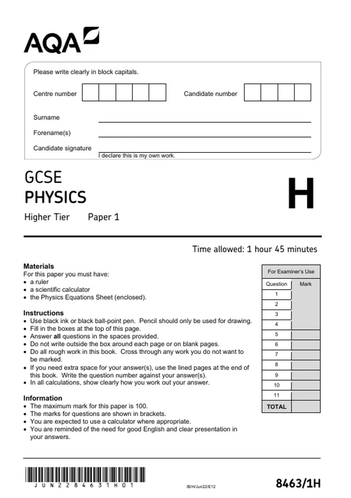 - AQA GCSE PHYSICS QUESTION PAPER 1 2023 8463-1H