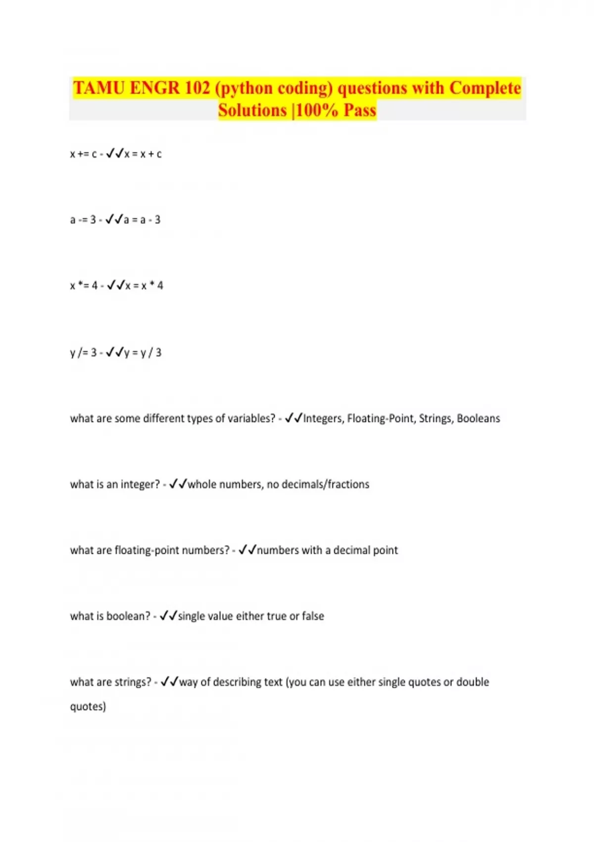 TAMU ENGR 102 (python coding) questions with Complete Solutions |100% Pass x += c - x = x + c a -= 3 - a = a - 3 x *= 4 - x = x * 4 y /= 3 - y = y / 3 what are some different types of variables? - Integers, Floating-Point, Strings, Booleans what is an integer? - whole numbers, no decimals/fractions what are floating-point numbers? - numbers with a decimal point what is boolean? - single value either true or false what are strings? - way of describing text (you can use either single quotes or double quotes) float(3) - value becomes 3.