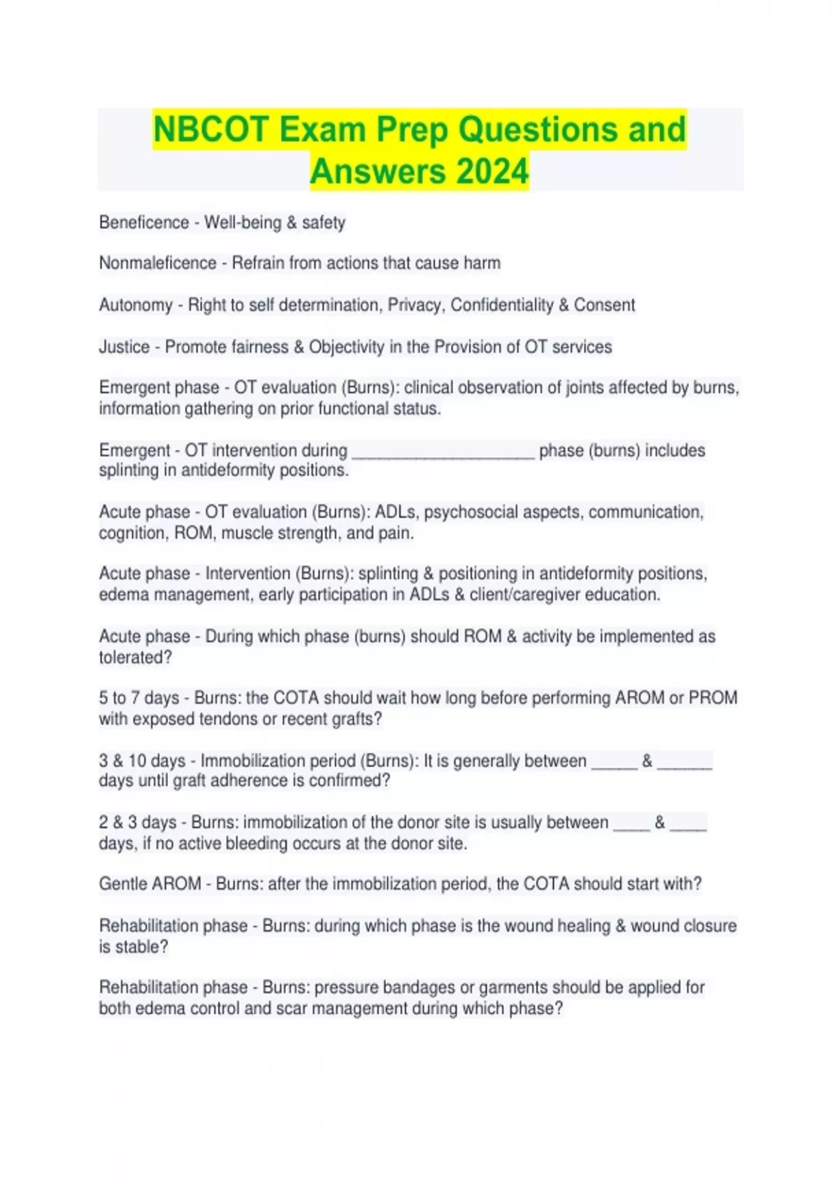 Beneficence - Well-being & safety Nonmaleficence - Refrain from actions that cause harm Autonomy - Right to self determination, Privacy, Confidentiality & Consent Justice - Promote fairness & Objectivity in the Provision of OT services Emergent phase - OT evaluation (Burns): clinical observation of joints affected by burns, information gathering on prior functional status. Emergent - OT intervention during ____________________ phase (burns) includes splinting in antideformity positions. Acute phase - OT evaluation (Burns): ADLs, psychosocial aspects, communication, cognition, ROM, muscle strength, and pain. Acute phase - Intervention (Burns): splinting & positioning in antideformity positions, edema management, early participation in ADLs & client/caregiver education. Acute phase - During which phase (burns) should ROM & activity be implemented as tolerated? 5 to 7 days - Burns: the COTA should wait how long before performing AROM or PROM with exposed tendons or recent grafts? 3 & 10 days - Immobilization period (Burns): It is generally between _____ & ______ days until graft adherence is confirmed? 2 & 3 days - Burns: immobilization of the donor site is usually between ____ & ____ days, if no active bleeding occurs at the donor site. Gentle AROM - Burns: after the immobilization period, the COTA should start with? Rehabilitation phase - Burns: during which phase is the wound healing & wound closure is stable? Rehabilitation phase - Burns: pressure bandages or garments should be applied for both edema control and scar management during which phase? Inflammation, proliferative, remodeling - Hand & UE: What are the 3 phases of wound healing? Boutonniere deformity - Hand & UE: disruption of the central slip of the extensor tendon characterized by PIP flexion & DIP hyperextension; the PIP is splinted in extension, & isolated DIP flexion exercises are performed. Boutonniere deformity - Hand & UE: Which deformity is the PIP joint splinted in extension? Swan neck deformity - Hand & UE: injury to the MCP, PIP, or DIP joints characterized by PIP hyperextension & DIP flexion. Swan neck deformity - Hand & UE: Which deformity is the PIP joint splinted in slight flexion? Interventions for fx healing - Hand & UE: modalities for pain relief & tissue healing include heat, ultrasound, cryotherapy, paraffin, and TENS. 3 to 6 weeks - Hand & UE: controlled AROM begins ___ to ____ weeks after fx if fixation is stable. Smith's fracture - Hand & UE: complete fx of the distal radius with palmar displacement. Bennet's fracture - Hand & UE: fracture of the first metacarpal base Colles fracture - Hand & UE: complete fx of the distal radius with dorsal displacement Nondisplaced fracture - Hand & UE: what type of fx can be treated with a long arm sling? Displaced with single fragment - Hand & UE: this type of fx is typically treated nonoperatively with immobilization for 2-3 weeks and early motion with medical clearance Comminuted - Hand & UE: this type of fx is treated operatively, with immobilization & early motion within the first postoperative week as medically prescribed High level nerve injury - Hand & UE: which nerve injury results in hyperextension of the ring and small finger MCP joints because of loss of the extension-controlling forces of the third & fourth lumbricals? Self-efficacy - Hand & UE: facilitates independent follow-through in the home context. Extensors & supinators - Hand & UE: Radial nerve innervates what group of muscles?