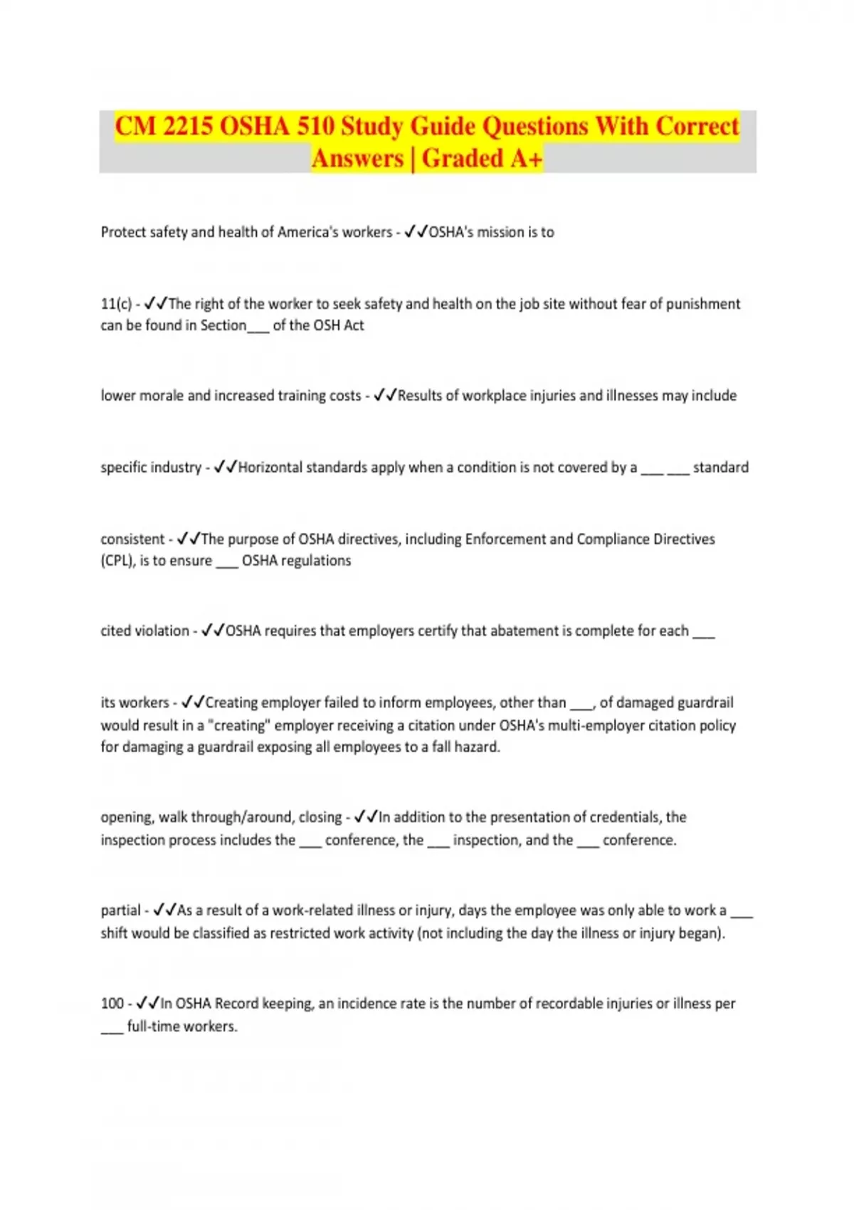 CM 2215 OSHA 510 Study Guide Questions With Correct Answers | Graded A+ Protect safety and health of America's workers - OSHA's mission is to 11(c) - The right of the worker to seek safety and health on the job site without fear of punishment can be found in Section___ of the OSH Act lower morale and increased training costs - Results of workplace injuries and illnesses may include specific industry - Horizontal standards apply when a condition is not covered by a ___ ___ standard consistent - The purpose of OSHA directives, including Enforcement and Compliance Directives (CPL), is to ensure ___ OSHA regulations cited violation - OSHA requires that employers certify that abatement is complete for each ___ its workers - Creating employer failed to inform employees, other than ___, of damaged guardrail would result in a "creating" employer receiving a citation under OSHA's multi-employer citation policy for damaging a guardrail exposing all employees to a fall hazard. opening, walk through/around, closing - In addition to the presentation of credentials, the inspection process includes the ___ conference, the ___ inspection, and the ___ conference. partial - As a result of a work-related illness or injury, days the employee was only able to work a ___ shift would be classified as restricted work activity (not including the day the illness or injury began). 100 - In OSHA Record keeping, an incidence rate is the number of recordable injuries or illness per ___ full-time workers.