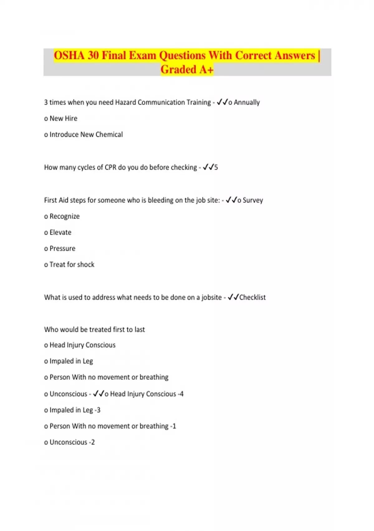 OSHA 30 Final Exam Questions With Correct Answers | Graded A+ 3 times when you need Hazard Communication Training - o Annually o New Hire o Introduce New Chemical How many cycles of CPR do you do before checking - 5 First Aid steps for someone who is bleeding on the job site: - o Survey o Recognize o Elevate o Pressure o Treat for shock What is used to address what needs to be done on a jobsite - Checklist Who would be treated first to last o Head Injury Conscious o Impaled in Leg o Person With no movement or breathing o Unconscious - o Head Injury Conscious -4 o Impaled in Leg -3 o Person With no movement or breathing -1 o Unconscious -2