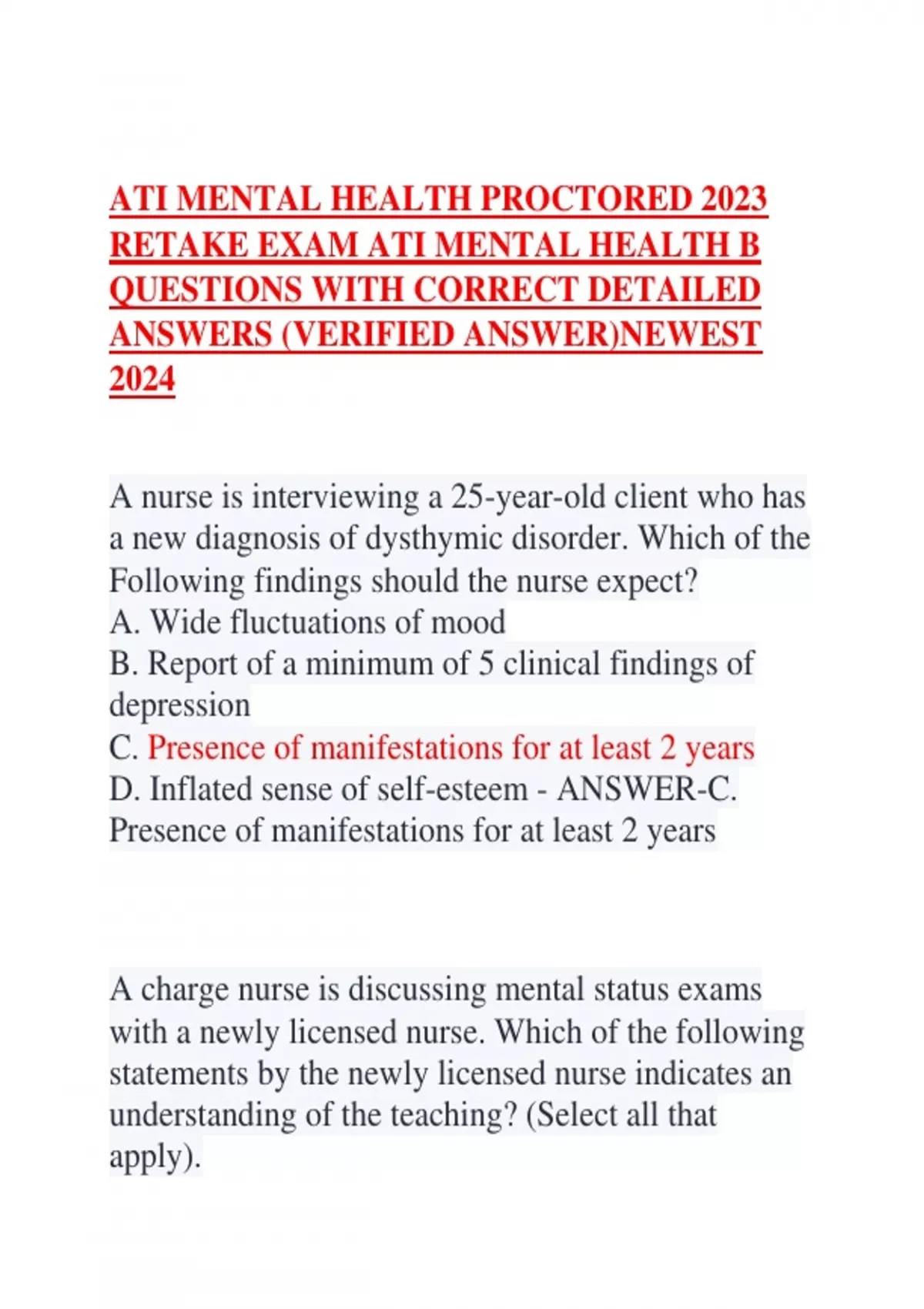 TI MENTAL HEALTH PROCTORED 2023 RETAKE EXAM ATI MENTAL HEALTH B QUESTIONS WITH CORRECT DETAILED ANSWERS (VERIFIED ANSWER)NEWEST 2024 A nurse is interviewing a 25-year-old client who has a new diagnosis of dysthymic disorder. Which of the Following findings should the nurse expect? A. Wide fluctuations of mood B. Report of a minimum of 5 clinical findings of depression C. Presence of manifestations for at least 2 years D. Inflated sense of self-esteem - ANSWER-C. Presence of manifestations for at least 2 years A charge nurse is discussing mental status exams with a newly licensed nurse. Which of the following statements by the newly licensed nurse indicates an understanding of the teaching? (Select all that apply). A. "To assess cognitive ability, I should ask the client to count backward by sevens." B. "To assess affect, I should observe the client's facial expression. C. "To assess language ability, I should instruct the client to write a sentence." D. "To assess remote memory, I should have the c - ANSWER-A. "To assess cognitive ability, I should ask the client to count backward by sevens." B. "To assess affect, I should observe the client's facial expression. C. "To assess language ability, I should instruct the client to write a sentence." A