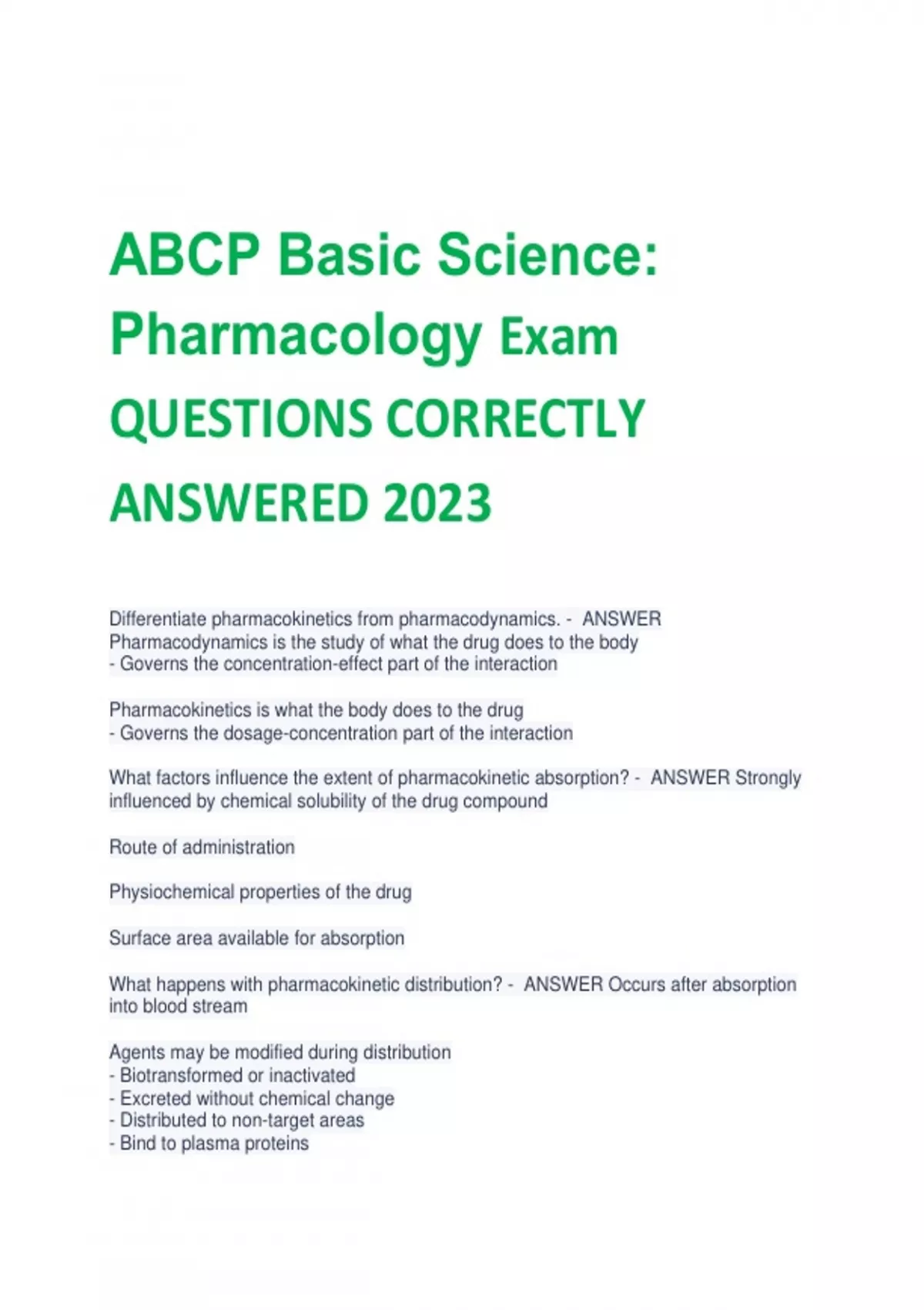 ABCP Basic Science: Pharmacology Exam QUESTIONS CORRECTLY ANSWERED 2023 Differentiate pharmacokinetics from pharmacodynamics. - ANSWER Pharmacodynamics is the study of what the drug does to the body - Governs the concentration-effect part of the interaction Pharmacokinetics is what the body does to the drug - Governs the dosage-concentration part of the interaction What factors influence the extent of pharmacokinetic absorption? - ANSWER Strongly influenced by chemical solubility of the drug compound Route of administration Physiochemical properties of the drug Surface area available for absorption