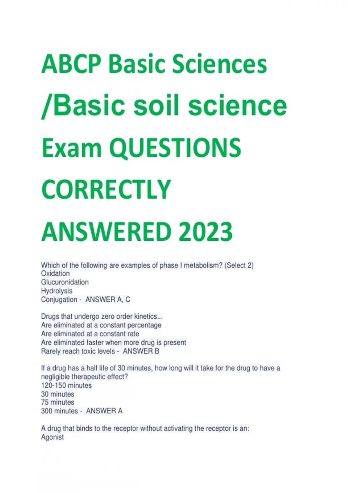 ABCP Basic Sciences /Basic soil science Exam QUESTIONS CORRECTLY ANSWERED 2023 Which of the following are examples of phase I metabolism? (Select 2) Oxidation Glucuronidation Hydrolysis Conjugation - ANSWER A, C Drugs that undergo zero order kinetics... Are eliminated at a constant percentage Are eliminated at a constant rate Are eliminated faster when more drug is present Rarely reach toxic levels - ANSWER B