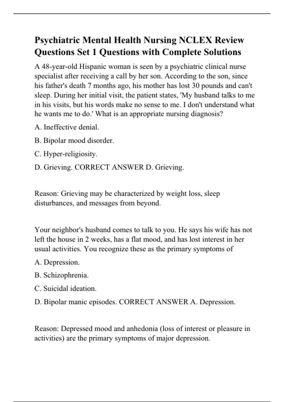 Psychiatric Mental Health Nursing NCLEX Review Questions Set 1 Questions with Complete Solutions