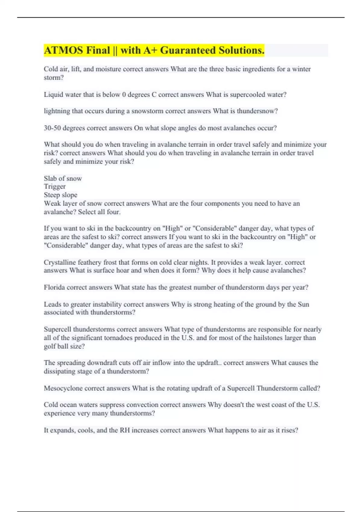 Cold air, lift, and moisture correct answers What are the three basic ingredients for a winter storm? Liquid water that is below 0 degrees C correct answers What is supercooled water? lightning that occurs during a snowstorm correct answers What is thundersnow? 30-50 degrees correct answers On what slope angles do most avalanches occur? What should you do when traveling in avalanche terrain in order travel safely and minimize your risk? correct answers What should you do when traveling in avalanche terrain in order travel safely and minimize your risk? Slab of snow Trigger Steep slope Weak layer of snow correct answers What are the four components you need to have an avalanche? Select all four. If you want to ski in the backcountry on "High" or "Considerable" danger day, what types of areas are the safest to ski? correct answers If you want to ski in the backcountry on "High" or "Considerable" danger day, what types of areas are the safest to ski? Crystalline feathery frost that forms on cold clear nights. It provides a weak layer. correct answers What is surface hoar and when does it form? Why does it help cause avalanches? Florida correct answers What state has the greatest number of thunderstorm days per year? Leads to greater instability correct answers Why is strong heating of the ground by the Sun associated with thunderstorms? Supercell thunderstorms correct answers What type of thunderstorms are responsible for nearly all of the significant tornadoes produced in the U.S. and for most of the hailstones larger than golf ball size? The spreading downdraft cuts off air inflow into the updraft.. correct answers What causes the dissipating stage of a thunderstorm? Mesocyclone correct answers What is the rotating updraft of a Supercell Thunderstorm called? Cold ocean waters suppress convection correct answers Why doesn't the west coast of the U.S. experience very many thunderstorms? It expands, cools, and the RH increases correct answers What happens to air as it rises?