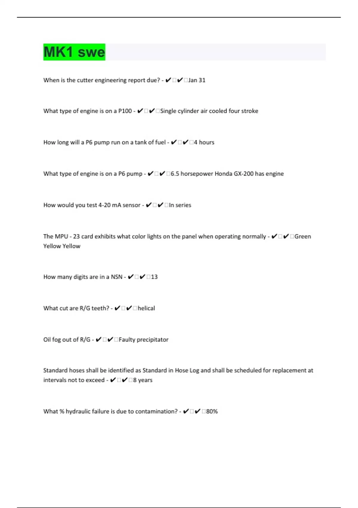 When is the cutter engineering report due? - ️️Jan 31 What type of engine is on a P100 - ️️Single cylinder air cooled four stroke How long will a P6 pump run on a tank of fuel - ️️4 hours What type of engine is on a P6 pump - ️️6.5 horsepower Honda GX-200 has engine How would you test 4-20 mA sensor - ️️In series The MPU - 23 card exhibits what color lights on the panel when operating normally - ️️Green Yellow Yellow How many digits are in a NSN - ️️13 What cut are R/G teeth? - ️️helical Oil fog out of R/G - ️️Faulty precipitator Standard hoses shall be identified as Standard in Hose Log and shall be scheduled for replacement at intervals not to exceed - ️️8 years What % hydraulic failure is due to contamination? - ️️80%