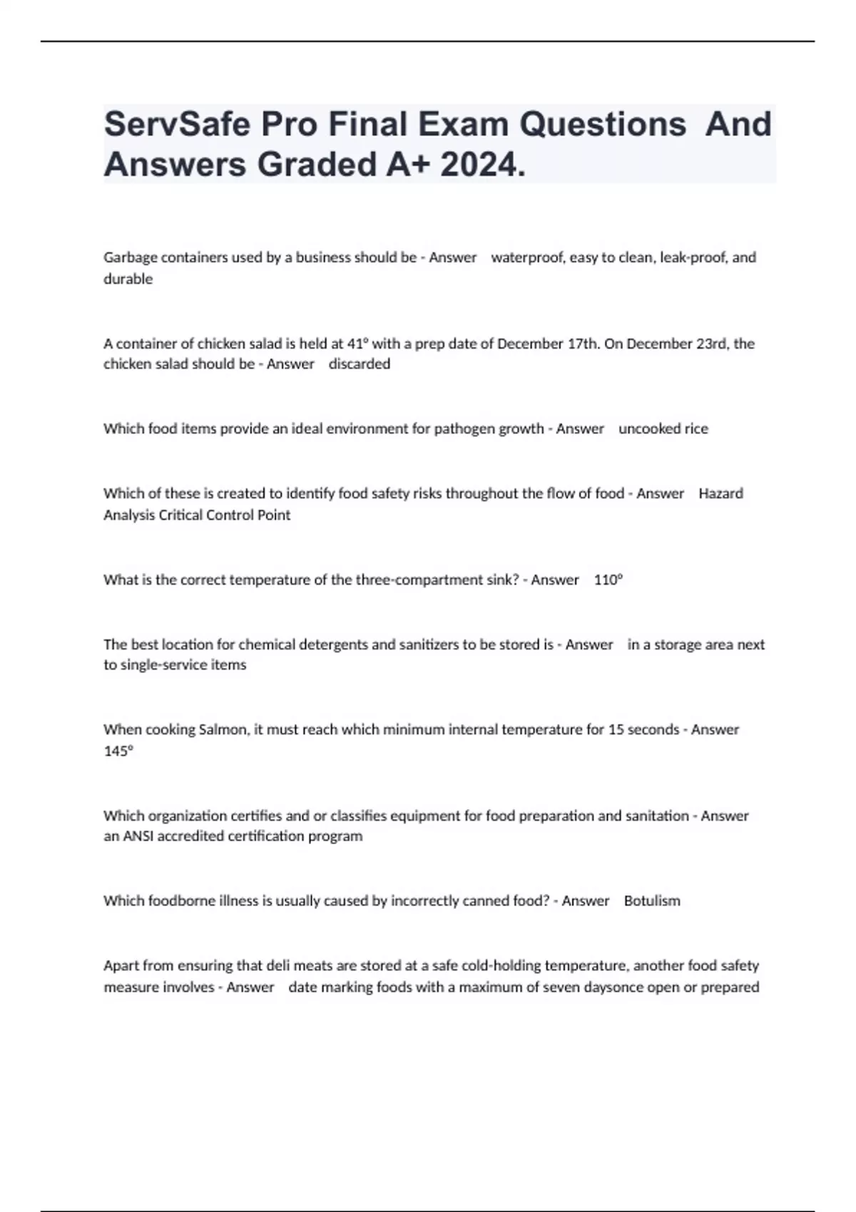 Garbage containers used by a business should be - Answer waterproof, easy to clean, leak-proof, and durable A container of chicken salad is held at 41° with a prep date of December 17th. On December 23rd, the chicken salad should be - Answer discarded Which food items provide an ideal environment for pathogen growth - Answer uncooked rice Which of these is created to identify food safety risks throughout the flow of food - Answer Hazard Analysis Critical Control Point What is the correct temperature of the three-compartment sink? - Answer 110° The best location for chemical detergents and sanitizers to be stored is - Answer in a storage area next to single-service items When cooking Salmon, it must reach which minimum internal temperature for 15 seconds - Answer 145° Which organization certifies and or classifies equipment for food preparation and sanitation - Answer an ANSI accredited certification program Which foodborne illness is usually caused by incorrectly canned food? - Answer Botulism Apart from ensuring that deli meats are stored at a safe cold-holding temperature, another food safety measure involves - Answer date marking foods with a maximum of seven daysonce open or prepared