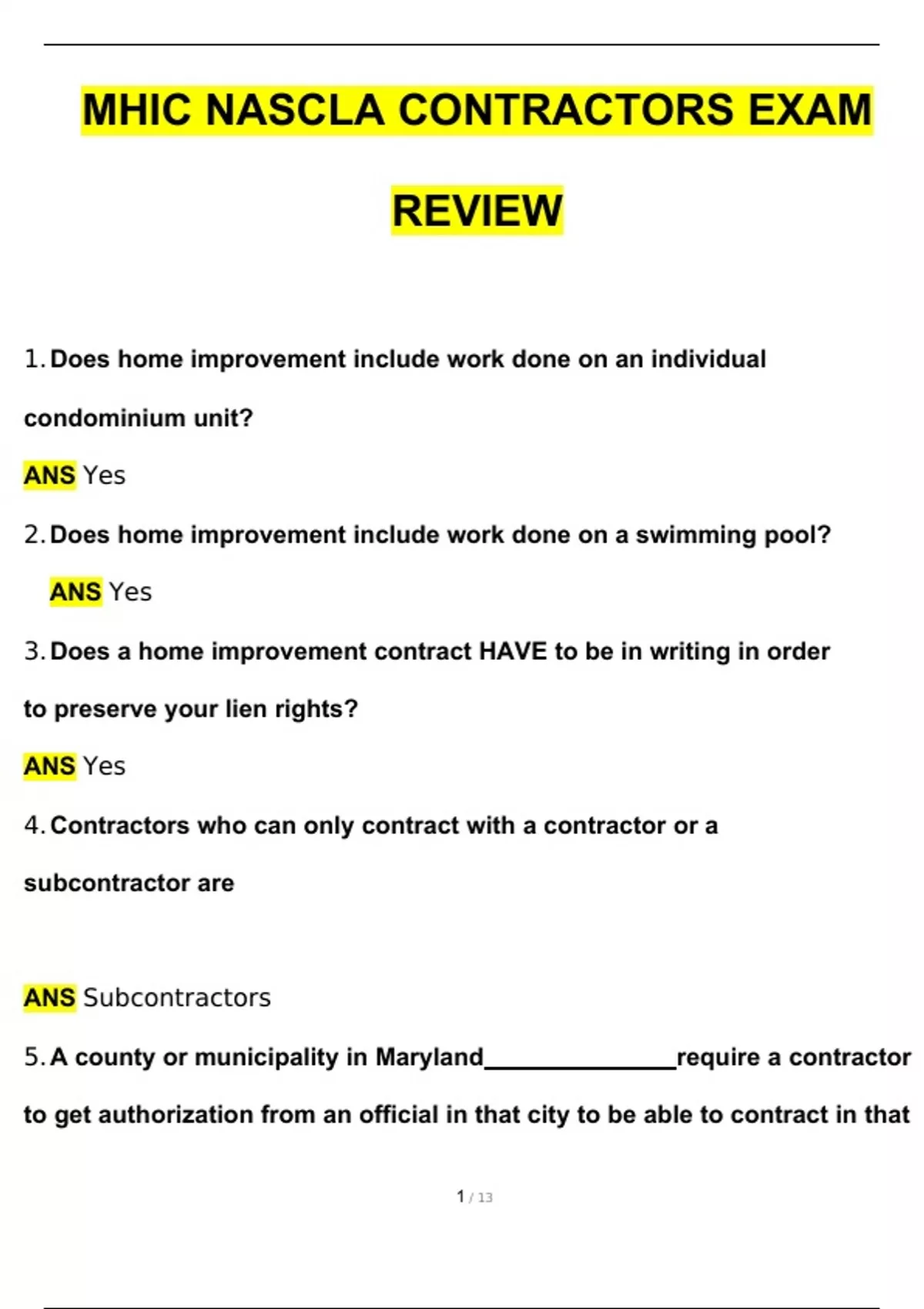 MHIC NASCLA CONTRACTORS EXAM REVIEW Questions and Answers (2024 / 2025) (Verified Answers)