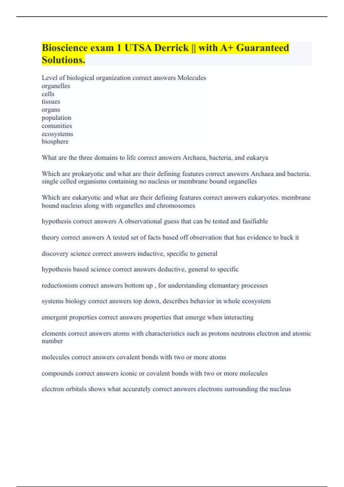 Bioscience exam 1 UTSA Derrick || with A+ Guaranteed Solutions.