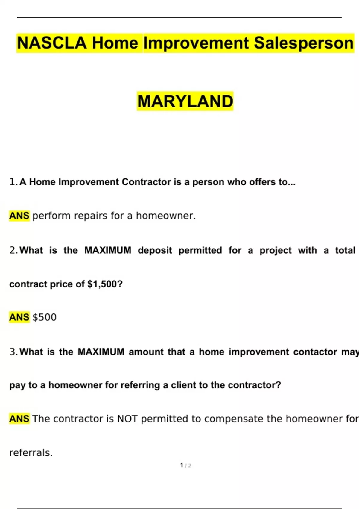 NASCLA Home Improvement Salesperson MARYLAND Questions With 100% Correct Answers