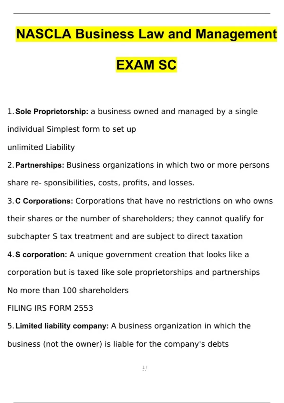 1.Sole Proprietorship: a business owned and managed by a single