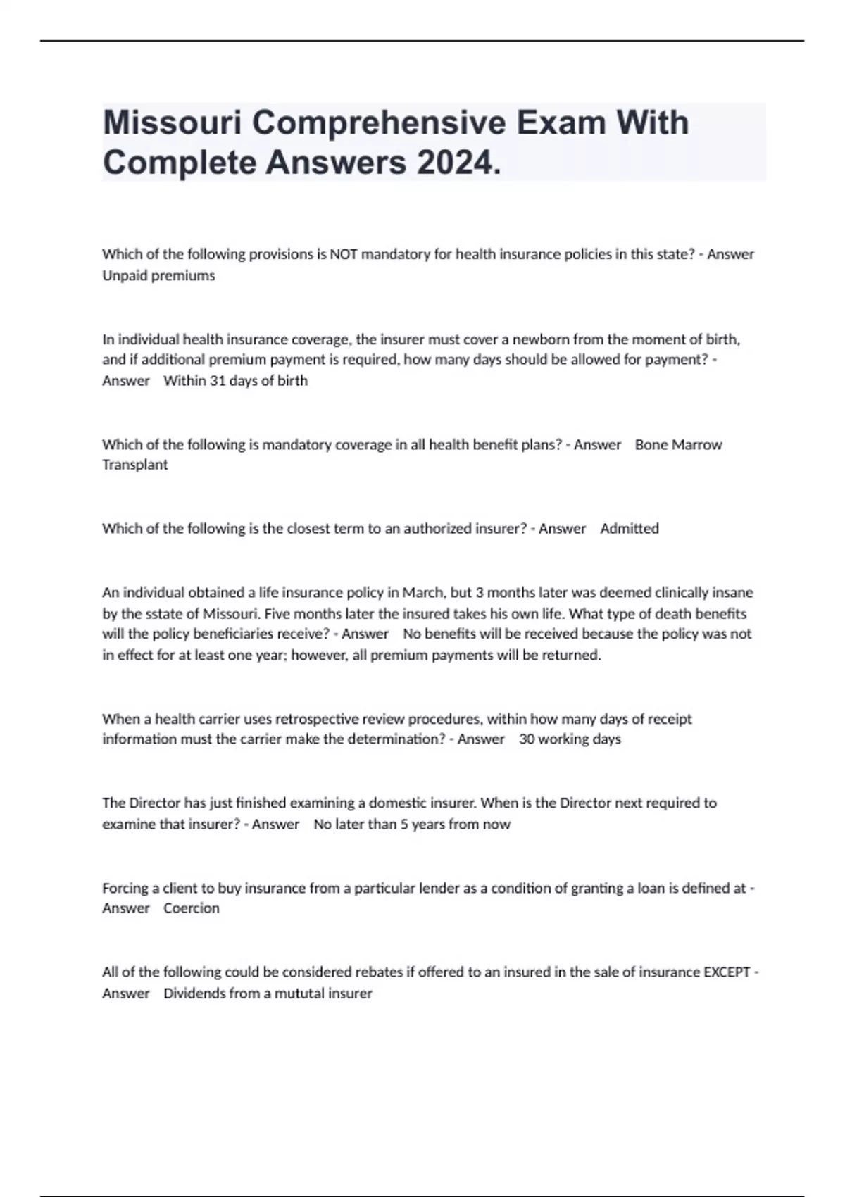 Which of the following provisions is NOT mandatory for health insurance policies in this state? - Answer Unpaid premiums In individual health insurance coverage, the insurer must cover a newborn from the moment of birth, and if additional premium payment is required, how many days should be allowed for payment? - Answer Within 31 days of birth Which of the following is mandatory coverage in all health benefit plans? - Answer Bone Marrow Transplant Which of the following is the closest term to an authorized insurer? - Answer Admitted An individual obtained a life insurance policy in March, but 3 months later was deemed clinically insane by the sstate of Missouri. Five months later the insured takes his own life. What type of death benefits will the policy beneficiaries receive? - Answer No benefits will be received because the policy was not in effect for at least one year; however, all premium payments will be returned. When a health carrier uses retrospective review procedures, within how many days of receipt information must the carrier make the determination? - Answer 30 working days The Director has just finished examining a domestic insurer. When is the Director next required to examine that insurer? - Answer No later than 5 years from now Forcing a client to buy insurance from a particular lender as a condition of granting a loan is defined at - Answer Coercion All of the following could be considered rebates if offered to an insured in the sale of insurance EXCEPT - Answer Dividends from a mututal insurer