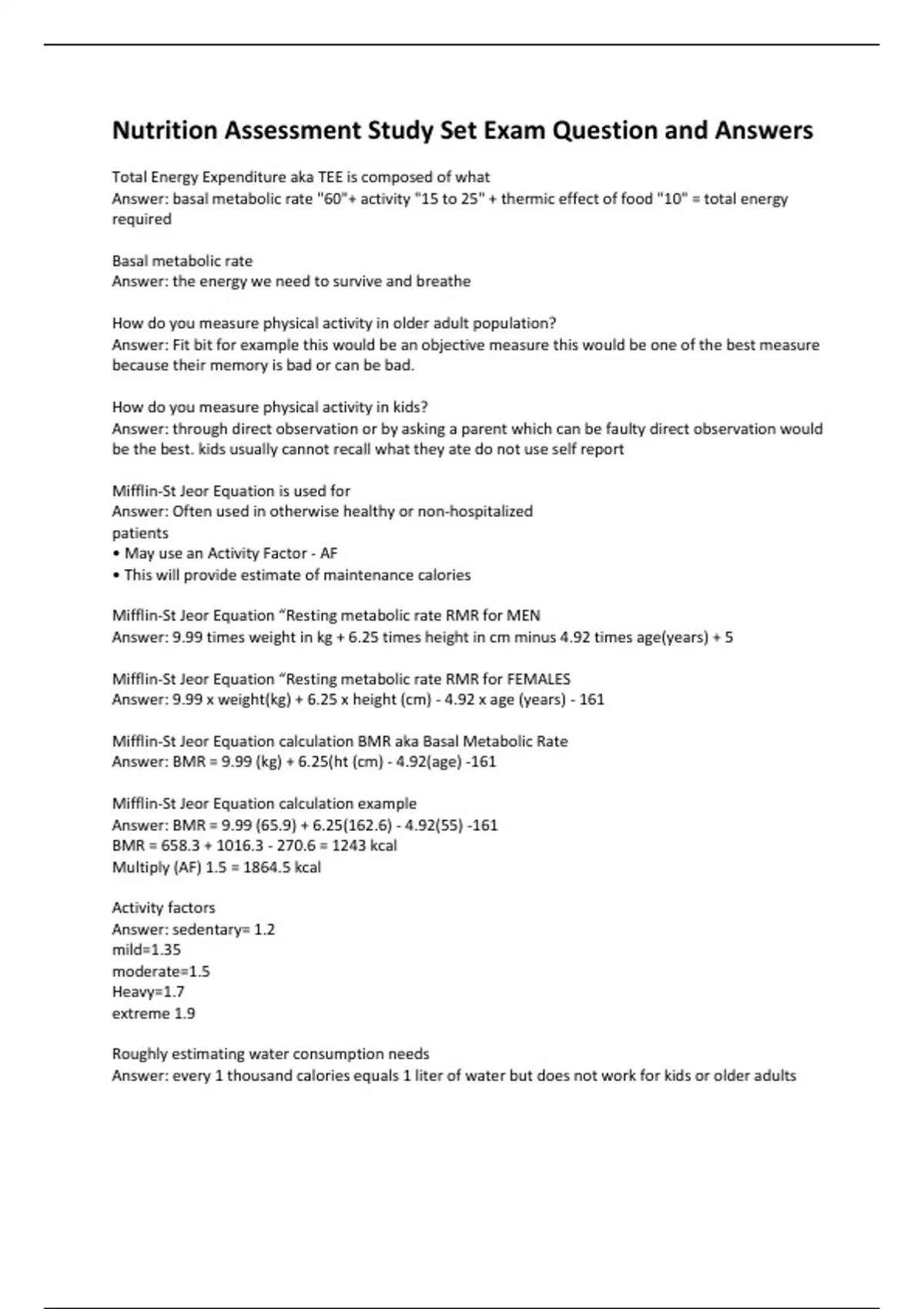 Nutrition Assessment Secrete Study Guide Exam Revision Test Question and Answers