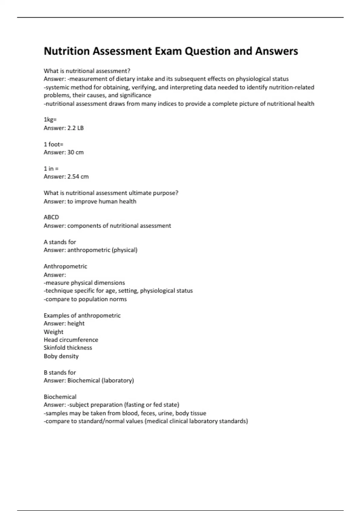 Nutrition Assessment Secrete Study Guide Exam Revision Test Question and Answers