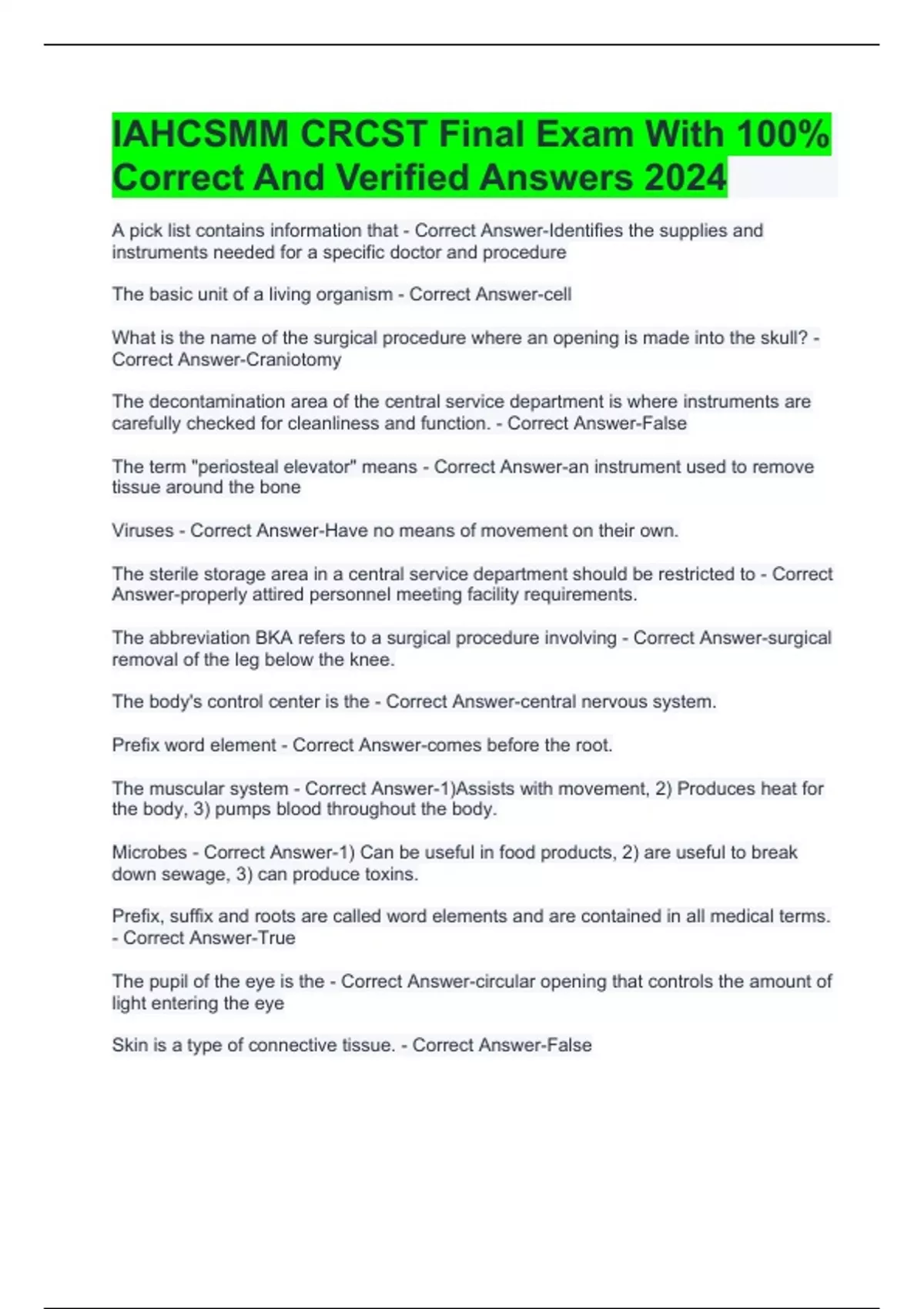 IAHCSMM CRCST Final Exam With 100% Correct And Verified Answers 2024