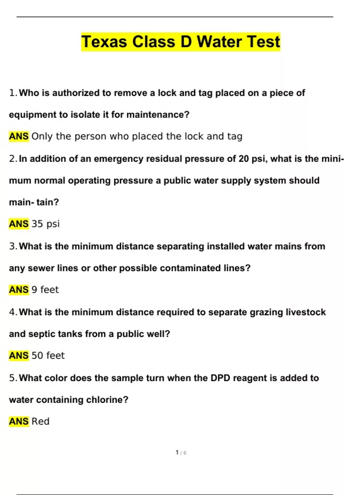 Texas Class D Water Test Updated Questions and Answers (2024 / 2025) (Verified Answers).1. Who is authorized to remove a lock and tag placed on a piece of equipment to isolate it for maintenance? ANS Only the person who placed the lock and tag 2. In addition of an emergency residual pressure of 20 psi, what is the mini- mum normal operating pressure a public water supply system should main- tain? ANS 35 psi 3. What is the minimum distance separating installed water mains from any sewer lines or other possible contaminated lines? ANS 9 feet 4. What is the minimum distance required to separate grazing livestock and septic tanks from a public well? ANS 50 feet 5. What color does the sample turn when the DPD reagent is added to water containing chlorine? ANS Red 6. A system is operating at a flow rate of 2.2 MGD. A chlorine dose of 10 mg/L is required to maintain a disinfectant residual of 0.4 mg/L. Calculate the daily chlorine demand in pounds. ANS 176 pounds 7. A tank with 1 foot of water above a pressure gauge at the bottom will register a reading of ANS 0.433 psi 8. Pipe and fittings used in public water systems may not contain more than % lead or solder and flux may not contain more than % lead. ANS 0.25%, 0.2%