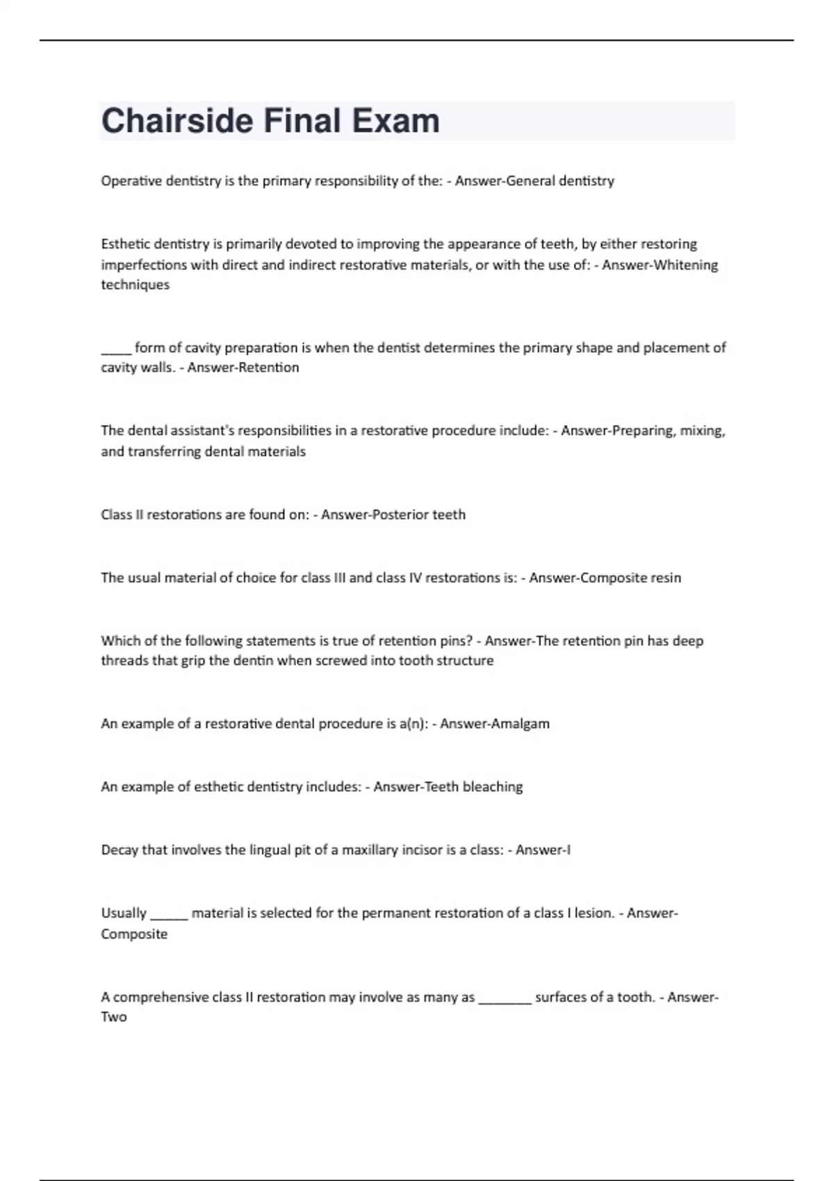 Chairside Final Exam (Questions & Answers) Passed!!