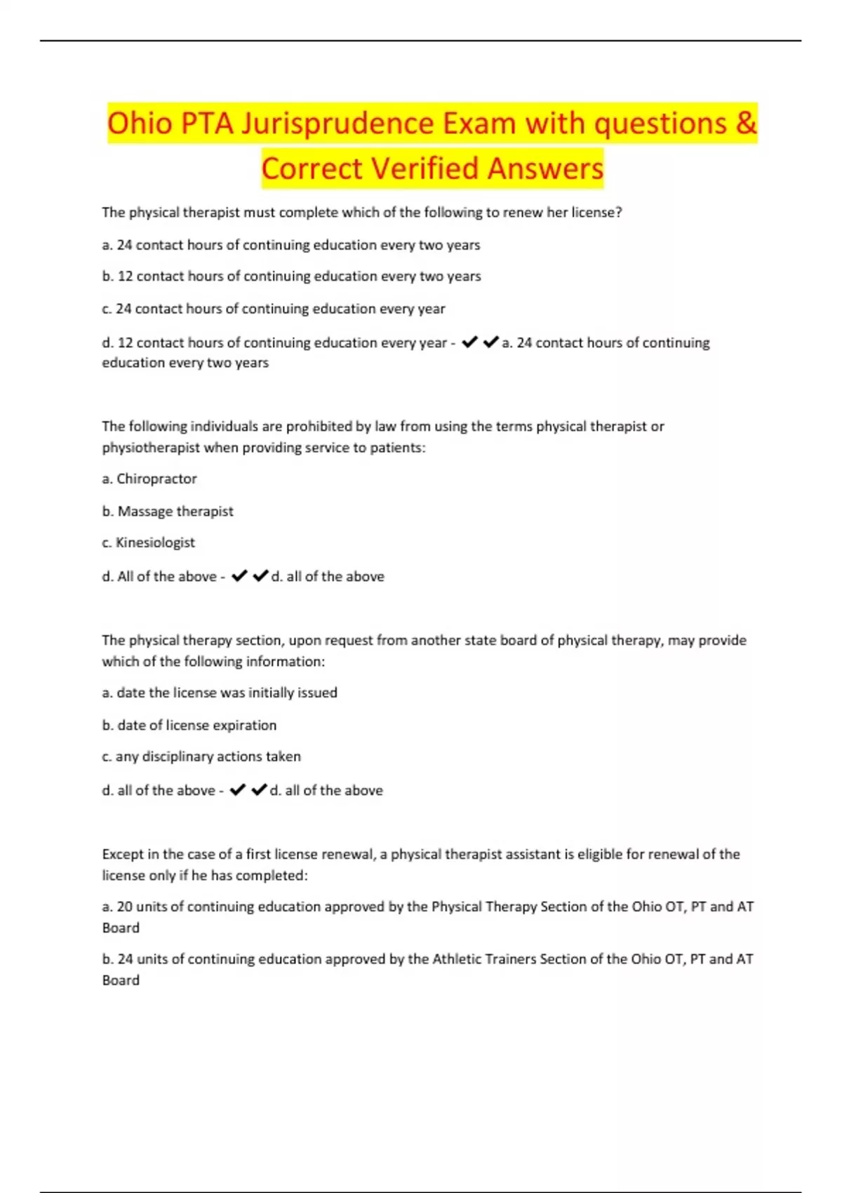 Ohio PTA Jurisprudence Exam with questions & Correct Verified Answers