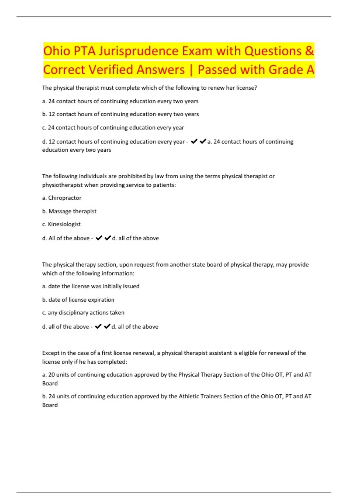 Ohio PTA Jurisprudence Exam with Questions & Correct Verified Answers | Passed with Grade A