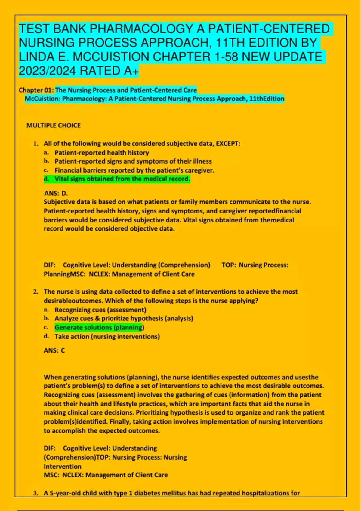 2022_ Test Bank for Pharmacology A Patient-Centered Nursing Process Approach, 11th Edition by Linda E. McCuistion Chapter 1-58|Complete Guide A+ Test Bank for Pharmacology 11th Edition Chapter 1-58 Test Bank for All Chapters Chapter 01: The Nursing Process and Patient-Centered Care Chapter 02: Drug Development and Ethical Considerations Chapter 03: Pharmacokinetics and Pharmacodynamics Chapter 04: Pharmacogenetics Chapter 05: Complementary and Alternative Therapies Chapter 06: Pediatric Considerations Chapter 07: Geriatric Considerations Chapter 08: Drugs in Substance Use Disorder Chapter 09: Safety and Quality Chapter 10: Drug Administration Chapter 11: Drug Calculations Chapter 12: Fluid Volume and Electrolytes Chapter 13: Vitamin and Mineral Replacement Chapter 14: Nutritional Support Chapter 15: Adrenergic Agonists and Antagonists Chapter 16: Cholinergic Agonists and Antagonists Chapter 17: Stimulants Chapter 18: Depressants Chapter 19: Antiseizure Drugs Chapter 20: Drugs for Parkinsonism and Alzheimer Disease Chapter 21: Drugs for Neuromuscular Disorders and Muscle Spasms Chapter 22: Antipsychotics and Anxiolytics Chapter 23: Antidepressants and Mood Stabilizers Chapter 24: Antiinflammatories Chapter 25: Analgesics Chapter 26: Penicillins, Other Beta-Lactams, and Cephalosporins Chapter 27: Macrolides, Oxazolidinones, Lincosamides, Glycopeptides, Ketolides, and Lipopeptides Chapter 28: Tetracyclines, Glycylcyclines, Aminoglycosides, and Fluoroquinolones Chapter 29: Sulfonamides and Nitroimidazoles Antibiotics Chapter 30: Antituberculars, Antifungals, and Antivirals Chapter 31: Antimalarials, Anthelmintics, and Peptides Chapter 32: HIV- and AIDS-Related Drugs Chapter 33: Transplant Drugs Chapter 34: Vaccines Chapter 35: Anticancer Drugs Chapter 36: Targeted Therapies to Treat Cancer Chapter 37: Biologic Response Modifiers Chapter 38: Upper Respiratory Disorders Chapter 39: Lower Respiratory Disorders Chapter 40: Cardiac Glycosides, Antianginals, and Antidysrhythmics Chapter 41: Diuretics Chapter 42: Antihypertensives Chapter 43: Anticoagulants, Antiplatelets, and Thrombolytics Chapter 44: Antihyperlipidemics and Drugs to Improve Peripheral Blood Flow Chapter 45: Gastrointestinal Tract Disorders Chapter 46: Antiulcer Drugs Chapter 47: Eye and Ear Disorders Chapter 48: Dermatologic Disorders Chapter 49: Pituitary, Thyroid, Parathyroid, and Adrenal Disorders Chapter 50: Antidiabetics Chapter 51: Urinary Disorders Chapter 52: Pregnancy and Preterm Labor Chapter 53: Labor, Delivery, and Postpartum Chapter 54: Neonatal and Newborn Chapter 55: Women’s Reproductive Health Chapter 56: Men’s Health and Reproductive Disorders Chapter 57: Sexually Transmitted Infections Chapter 58: Adult and Pediatric Emergency