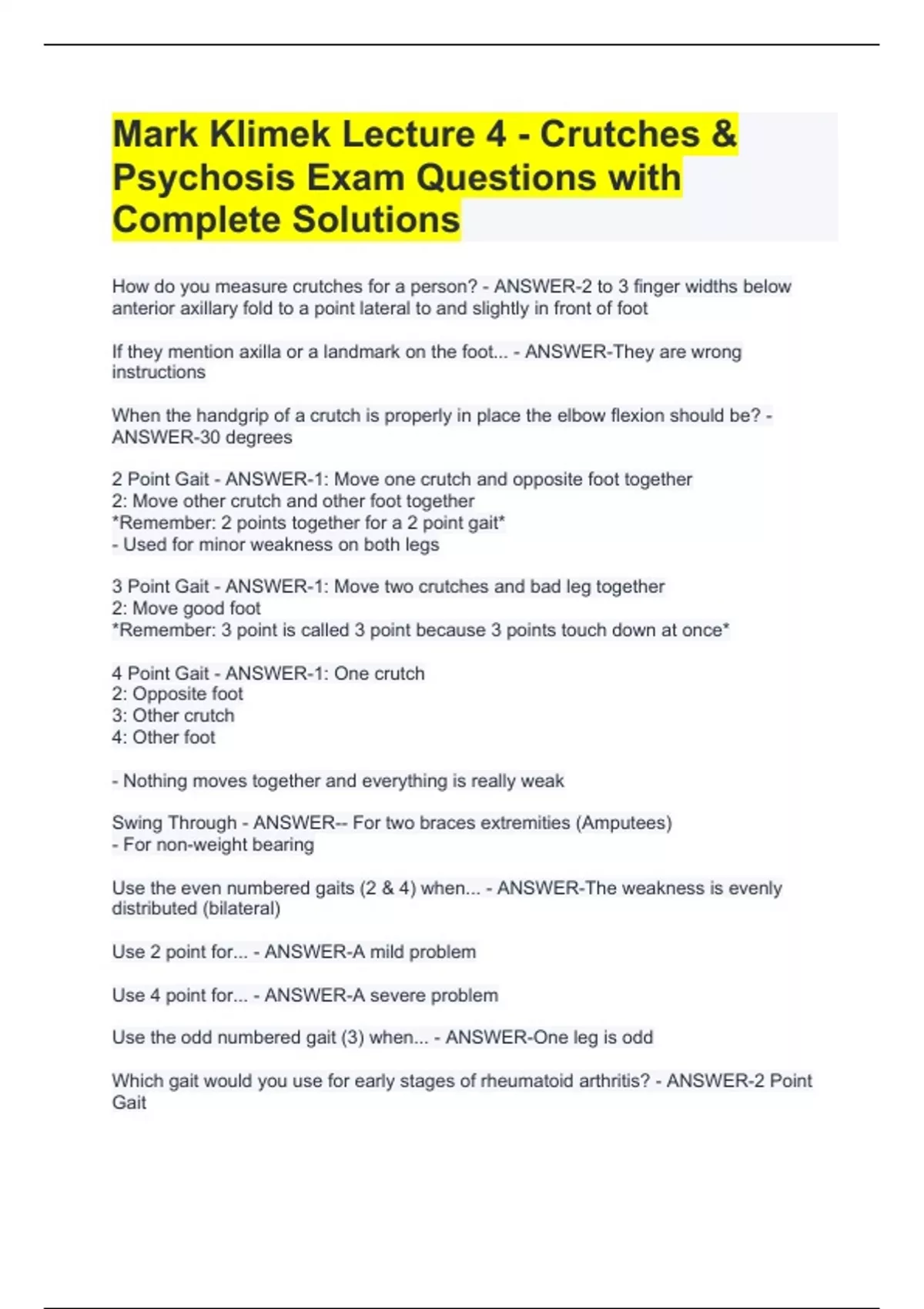 How do you measure crutches for a person? - ANSWER-2 to 3 finger widths below anterior axillary fold to a point lateral to and slightly in front of foot If they mention axilla or a landmark on the foot... - ANSWER-They are wrong instructions When the handgrip of a crutch is properly in place the elbow flexion should be? - ANSWER-30 degrees 2 Point Gait - ANSWER-1: Move one crutch and opposite foot together 2: Move other crutch and other foot together *Remember: 2 points together for a 2 point gait* - Used for minor weakness on both legs 3 Point Gait - ANSWER-1: Move two crutches and bad leg together 2: Move good foot *Remember: 3 point is called 3 point because 3 points touch down at once* 4 Point Gait - ANSWER-1: One crutch 2: Opposite foot 3: Other crutch 4: Other foot - Nothing moves together and everything is really weak Swing Through - ANSWER-- For two braces extremities (Amputees) - For non-weight bearing Use the even numbered gaits (2 & 4) when... - ANSWER-The weakness is evenly distributed (bilateral) Use 2 point for... - ANSWER-A mild problem Use 4 point for... - ANSWER-A severe problem Use the odd numbered gait (3) when... - ANSWER-One leg is odd Which gait would you use for early stages of rheumatoid arthritis? - ANSWER-2 Point Gait