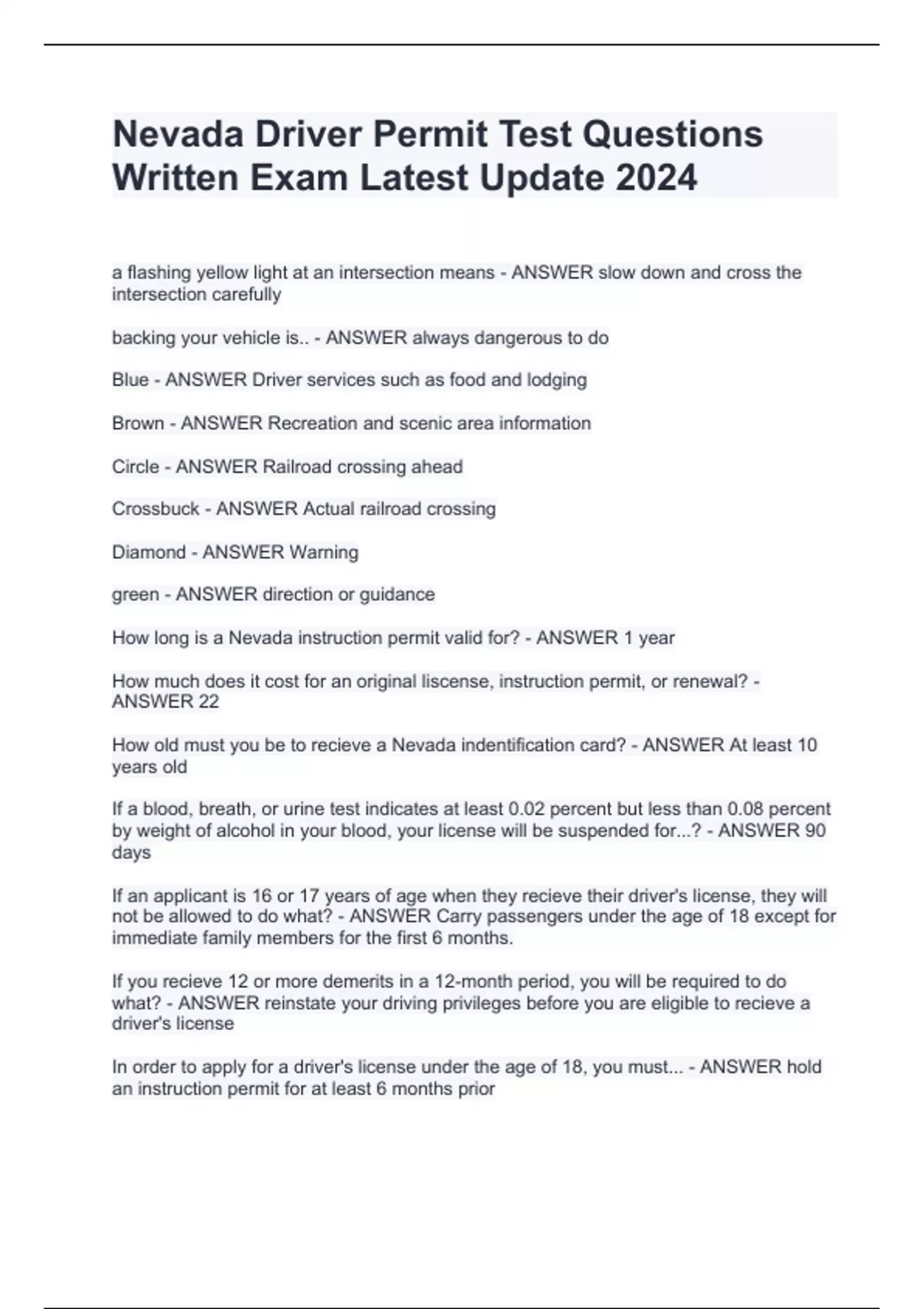 a flashing yellow light at an intersection means - ANSWER slow down and cross the intersection carefully backing your vehicle is.. - ANSWER always dangerous to do Blue - ANSWER Driver services such as food and lodging Brown - ANSWER Recreation and scenic area information Circle - ANSWER Railroad crossing ahead Crossbuck - ANSWER Actual railroad crossing Diamond - ANSWER Warning green - ANSWER direction or guidance How long is a Nevada instruction permit valid for? - ANSWER 1 year How much does it cost for an original liscense, instruction permit, or renewal? - ANSWER 22 How old must you be to recieve a Nevada indentification card? - ANSWER At least 10 years old If a blood, breath, or urine test indicates at least 0.02 percent but less than 0.08 percent by weight of alcohol in your blood, your license will be suspended for...? - ANSWER 90 days If an applicant is 16 or 17 years of age when they recieve their driver's license, they will not be allowed to do what? - ANSWER Carry passengers under the age of 18 except for immediate family members for the first 6 months. If you recieve 12 or more demerits in a 12-month period, you will be required to do what? - ANSWER reinstate your driving privileges before you are eligible to recieve a driver's license
