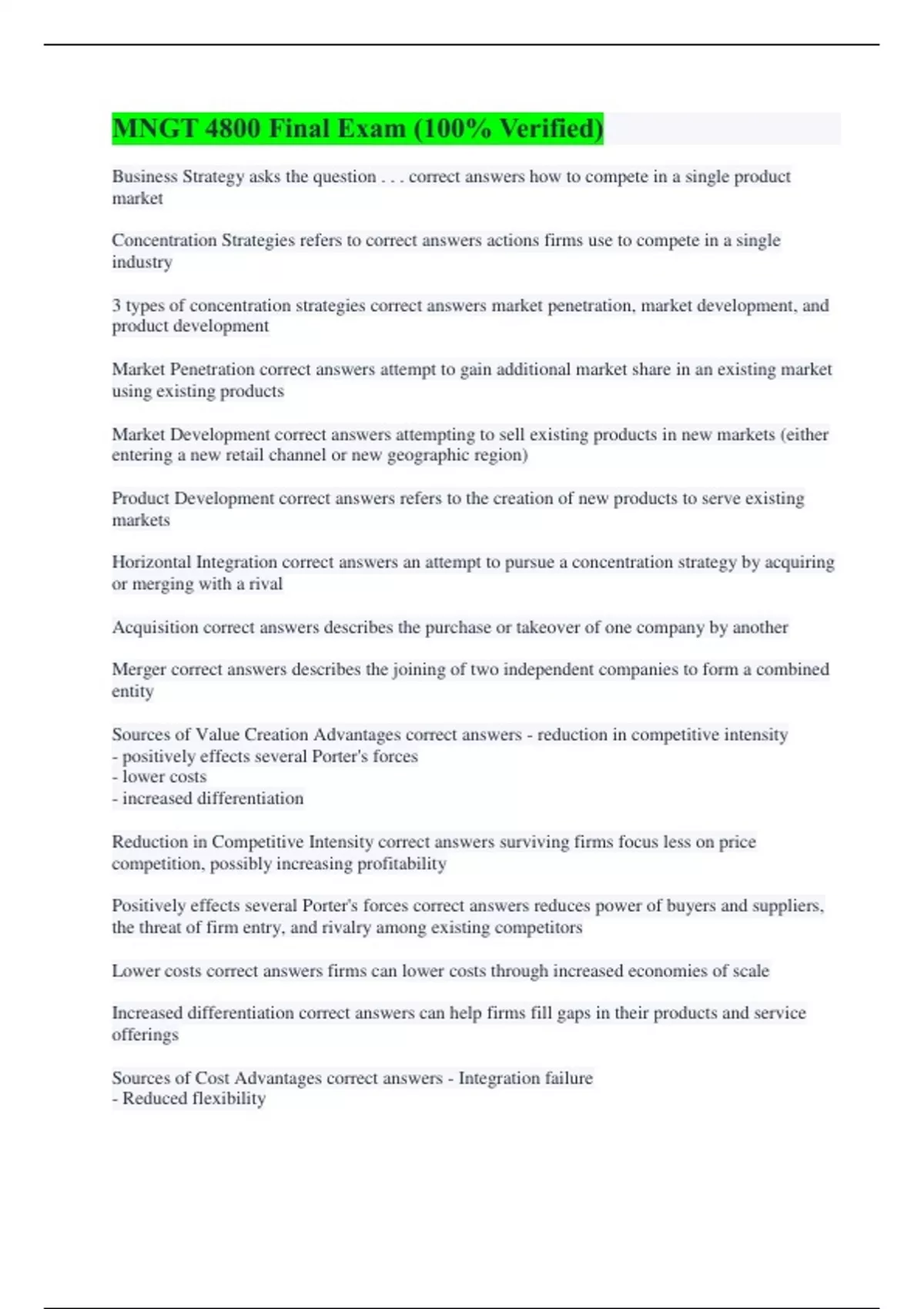 Business Strategy asks the question . . . correct answers how to compete in a single product market Concentration Strategies refers to correct answers actions firms use to compete in a single industry 3 types of concentration strategies correct answers market penetration, market development, and product development Market Penetration correct answers attempt to gain additional market share in an existing market using existing products Market Development correct answers attempting to sell existing products in new markets (either entering a new retail channel or new geographic region) Product Development correct answers refers to the creation of new products to serve existing markets Horizontal Integration correct answers an attempt to pursue a concentration strategy by acquiring or merging with a rival Acquisition correct answers describes the purchase or takeover of one company by another Merger correct answers describes the joining of two independent companies to form a combined entity Sources of Value Creation Advantages correct answers - reduction in competitive intensity - positively effects several Porter's forces - lower costs - increased differentiation Reduction in Competitive Intensity correct answers surviving firms focus less on price competition, possibly increasing profitability Positively effects several Porter's forces correct answers reduces power of buyers and suppliers, the threat of firm entry, and rivalry among existing competitors Lower costs correct answers firms can lower costs through increased economies of scale Increased differentiation correct answers can help firms fill gaps in their products and service offerings Sources of Cost Advantages correct answers - Integration failure - Reduced flexibility