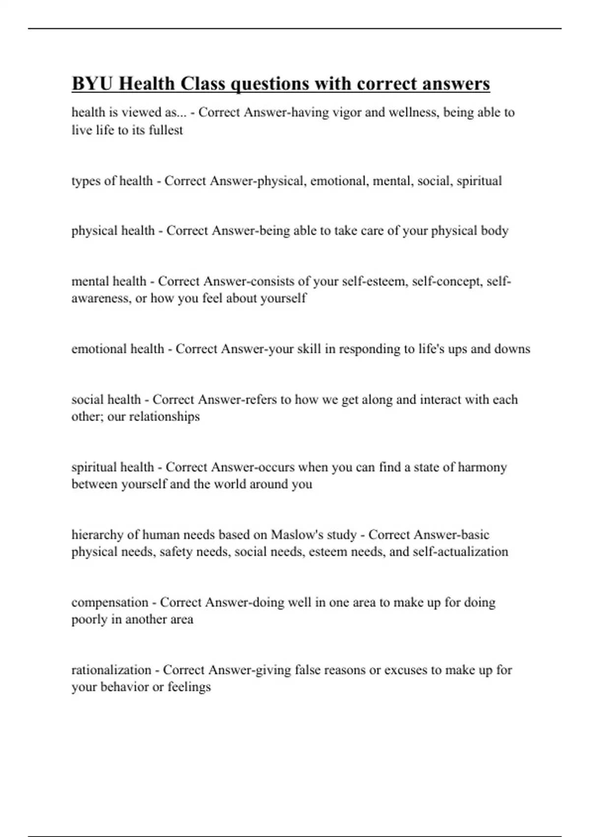 BYU Health Class questions with correct answers