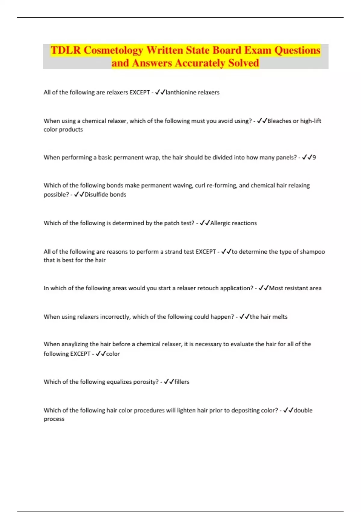 TDLR Cosmetology Written State Board Exam Questions and Answers Accurately Solved All of the following are relaxers EXCEPT - lanthionine relaxers When using a chemical relaxer, which of the following must you avoid using? - Bleaches or high-lift color products When performing a basic permanent wrap, the hair should be divided into how many panels? - 9 Which of the following bonds make permanent waving, curl re-forming, and chemical hair relaxing possible? - Disulfide bonds Which of the following is determined by the patch test? - Allergic reactions All of the following are reasons to perform a strand test EXCEPT - to determine the type of shampoo that is best for the hair In which of the following areas would you start a relaxer retouch application? - Most resistant area When using relaxers incorrectly, which of the following could happen? - the hair melts When anaylizing the hair before a chemical relaxer, it is necessary to evaluate the hair for all of the following EXCEPT - colo
