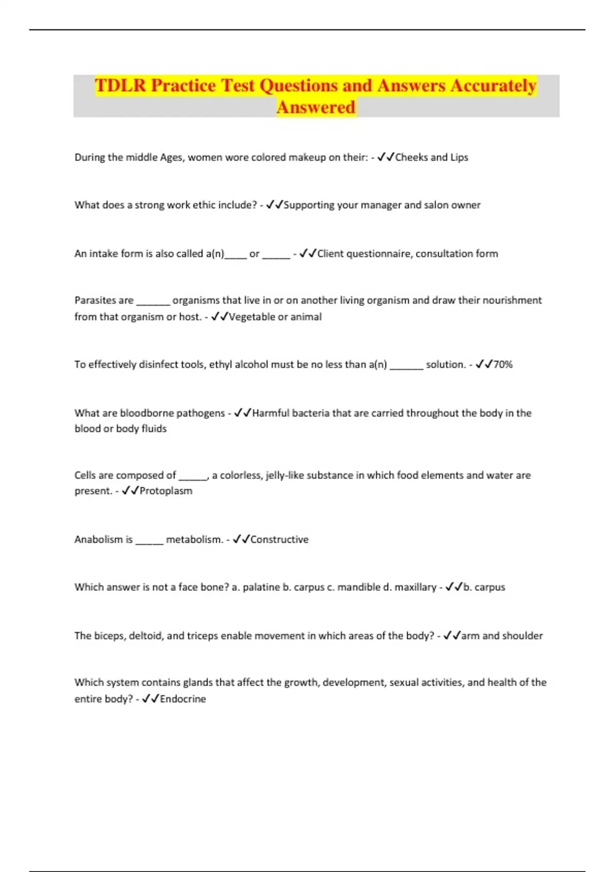 TDLR Practice Test Questions and Answers Accurately Answered During the middle Ages, women wore colored makeup on their: - Cheeks and Lips What does a strong work ethic include? - Supporting your manager and salon owner An intake form is also called a(n)____ or _____ - Client questionnaire, consultation form Parasites are ______ organisms that live in or on another living organism and draw their nourishment from that organism or host. - Vegetable or animal To effectively disinfect tools, ethyl alcohol must be no less than a(n) ______ solution. - 70% What are bloodborne pathogens - Harmful bacteria that are carried throughout the body in the blood or body fluids Cells are composed of _____, a colorless, jelly-like substance in which food elements and water are present. - Protoplasm Anabolism is _____ metabolism. - Constructive Which answer is not a face bone? a. palatine b. carpus c. mandible d. maxillary - b. carpus