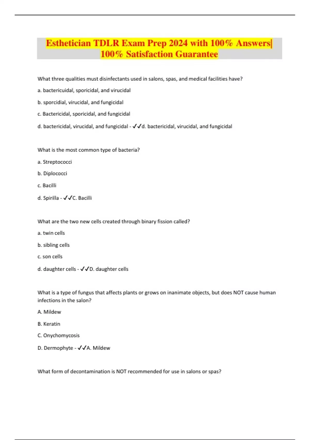 Esthetician TDLR Exam Prep 2024 with 100% Answers| 100% Satisfaction Guarantee What three qualities must disinfectants used in salons, spas, and medical facilities have? a. bactericuidal, sporicidal, and virucidal b. sporcidial, virucidal, and fungicidal c. Bactericidal, sporicidal, and fungicidal d. bactericidal, virucidal, and fungicidal - d. bactericidal, virucidal, and fungicidal What is the most common type of bacteria? a. Streptococci b. Diplococci c. Bacilli d. Spirilla - C. Bacilli What are the two new cells created through binary fission called? a. twin cells b. sibling cells c. son cells d. daughter cells - D. daughter cells What is a type of fungus that affects plants or grows on inanimate objects, but does NOT cause human infections in the salon? A. Mildew B. Keratin C. Onychomycosis D. Dermophyte - A. Mildew