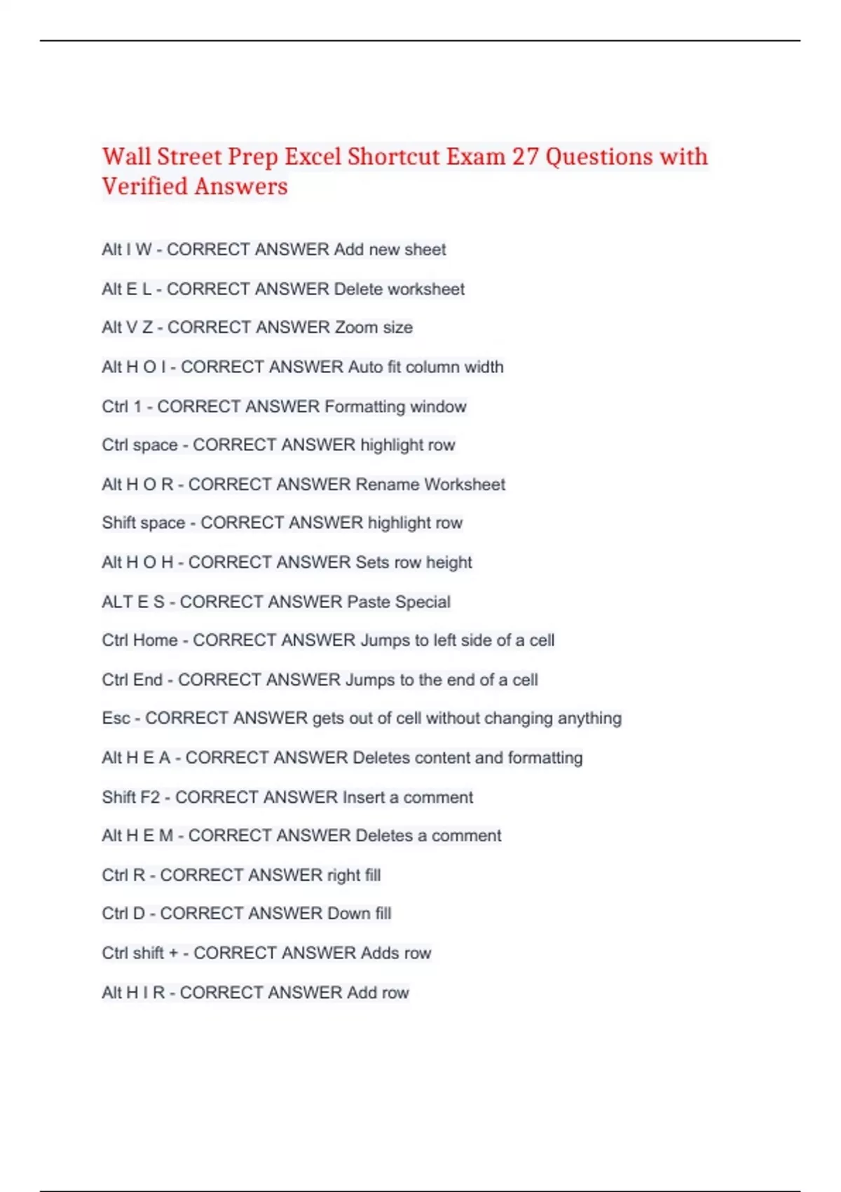 Wall Street Prep Excel Shortcut Exam 27 Questions with Verified Answers Alt I W - CORRECT ANSWER Add new sheet Alt E L - CORRECT ANSWER Delete worksheet Alt V Z - CORRECT ANSWER Zoom size Alt H O I - CORRECT ANSWER Auto fit column width Ctrl 1 - CORRECT ANSWER Formatting window Ctrl space - CORRECT ANSWER highlight row Alt H O R - CORRECT ANSWER Rename Worksheet Shift space - CORRECT ANSWER highlight row Alt H O H - CORRECT ANSWER Sets row height ALT E S - CORRECT ANSWER Paste Special Ctrl Home - CORRECT ANSWER Jumps to left side of a cell Ctrl End - CORRECT ANSWER Jumps to the end of a cell Esc - CORRECT ANSWER gets out of cell without changing anything Alt H E A - CORRECT ANSWER Deletes content and formatting Shift F2 - CORRECT ANSWER Insert a comment Alt H E M - CORRECT ANSWER Deletes a comment Ctrl R - CORRECT ANSWER right fill Ctrl D - CORRECT ANSWER Down fill Ctrl shift + - CORRECT ANSWER Adds row Alt H I R - CORRECT ANSWER Add row Alt H I C - CORRECT ANSWER Add column ALT E S E - CORRECT ANSWER Transpose Ctrl Shift ! - CORRECT ANSWER Formats with 2 decimal places Ctrl shift $ - CORRECT ANSWER Currency with 2 decimal places Ctrl shift % - CORRECT ANSWER Percentage format with 2 decimal places Ctrl shift # - CORRECT ANSWER Date format Ctrl shift _ - CORRECT ANSWER Removes all borders