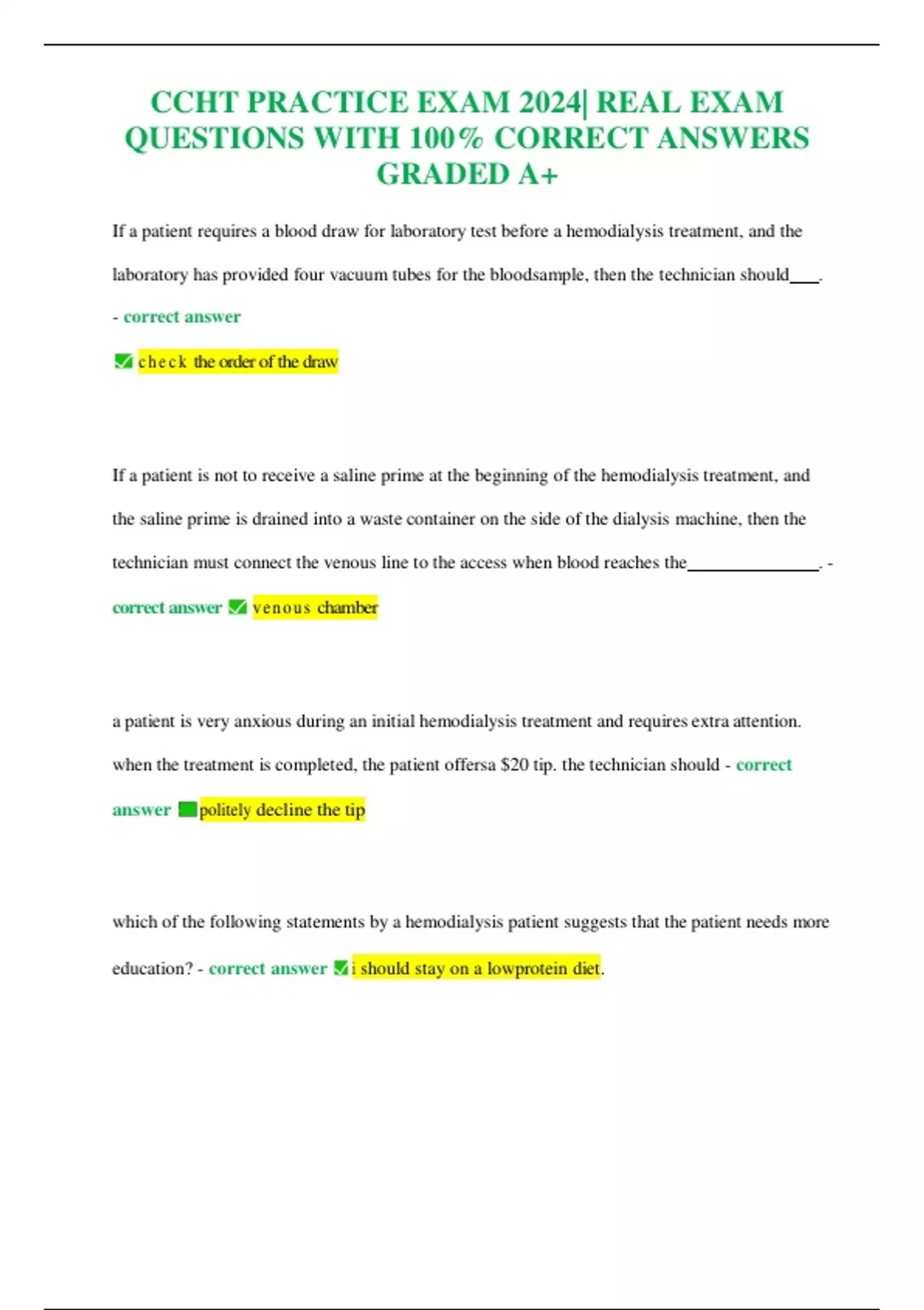 CCHT PRACTICE EXAM 2024| REAL EXAM QUESTIONS WITH 100% CORRECT ANSWERS GRADED A+ If a patient requires a blood draw for laboratory test before a hemodialysis treatment, and the laboratory has provided four vacuum tubes for the bloodsample, then the technician should . - correct answer ⬛c h e c k the order ofthe draw