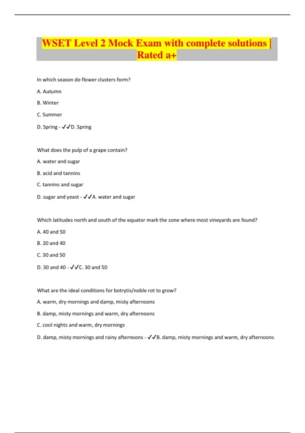 WSET Level 2 Mock Exam with complete solutions | Rated a+ In which season do flower clusters form? A. Autumn B. Winter C. Summer D. Spring - D. Spring What does the pulp of a grape contain? A. water and sugar B. acid and tannins C. tannins and sugar D. sugar and yeast - A. water and sugar Which latitudes north and south of the equator mark the zone where most vineyards are found? A. 40 and 50 B. 20 and 40 C. 30 and 50 D. 30 and 40 - C. 30 and 50 What are the ideal conditions for botrytis/noble rot to grow? A. warm, dry mornings and damp, misty afternoons B. damp, misty mornings and warm, dry afternoons C. cool nights and warm, dry mornings D. damp, misty mornings and rainy afternoons - B. damp, misty mornings and warm, dry afternoons