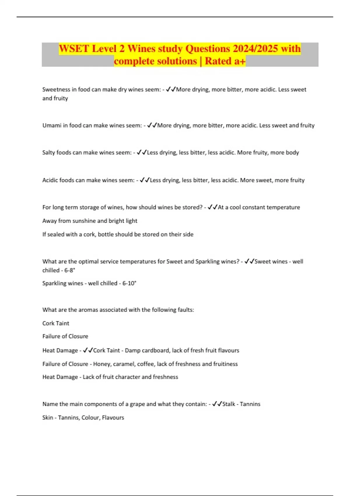 WSET Level 2 Wines study Questions 2024/2025 with complete solutions | Rated a+ Sweetness in food can make dry wines seem: - More drying, more bitter, more acidic. Less sweet and fruity Umami in food can make wines seem: - More drying, more bitter, more acidic. Less sweet and fruity Salty foods can make wines seem: - Less drying, less bitter, less acidic. More fruity, more body Acidic foods can make wines seem: - Less drying, less bitter, less acidic. More sweet, more fruity For long term storage of wines, how should wines be stored? - At a cool constant temperature Away from sunshine and bright light If sealed with a cork, bottle should be stored on their side What are the optimal service temperatures for Sweet and Sparkling wines? - Sweet wines - well chilled - 6-8° Sparkling wines - well chilled - 6-10° What are the aromas associated with the following faults: Cork Taint Failure of Closure Heat Damage - Cork Taint - Damp cardboard, lack of fresh fruit flavours Failure of Closure - Honey, caramel, coffee, lack of freshness and fruitiness Heat Damage - Lack of fruit character and freshness Name the main components of a grape and what they contain: - Stalk - Tannins Skin - Tannins, Colour, Flavours